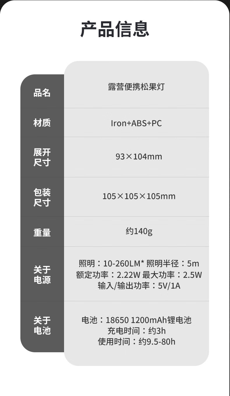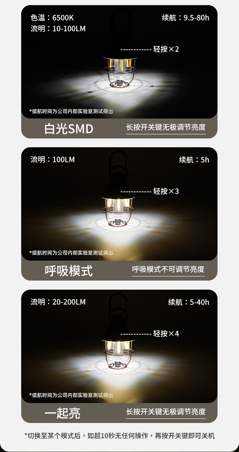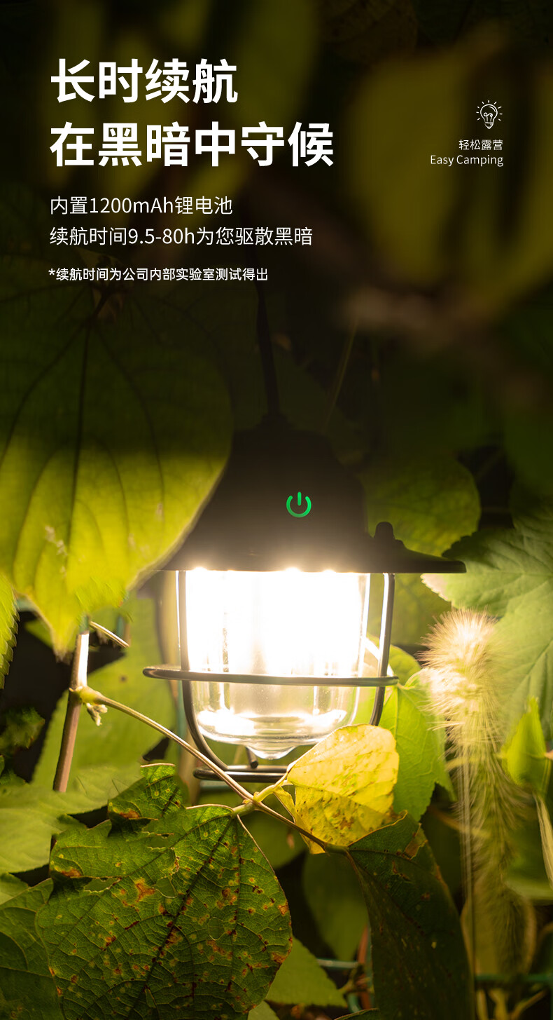 产品材质:有质感且造型独特、大气时尚; 光照强度:能满足四-五人帐篷使用,且不显暗; 续航时间:与产品介绍描述一致,非常耐用; 产品重量:较轻; 电源类型:充电式,与说明书介绍一致。