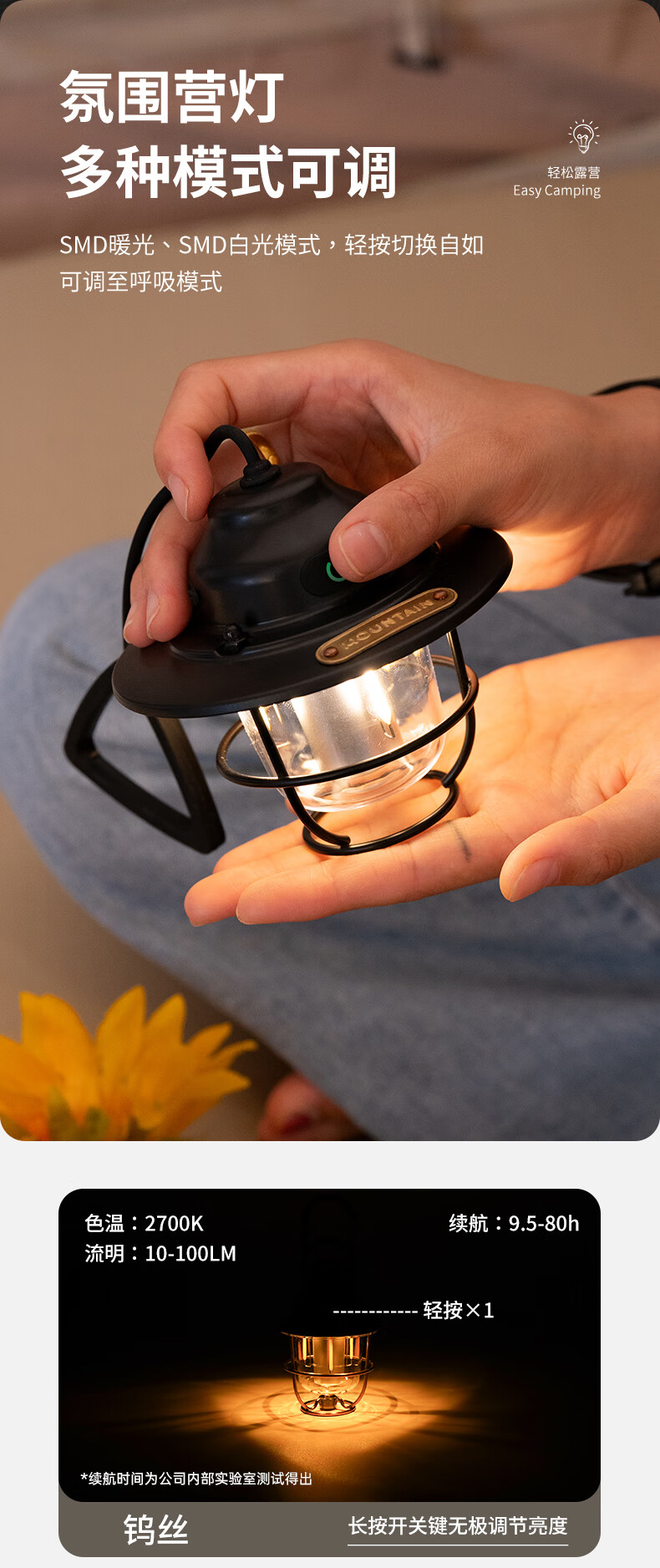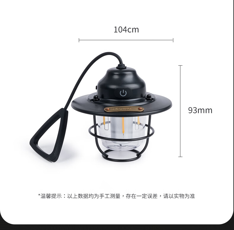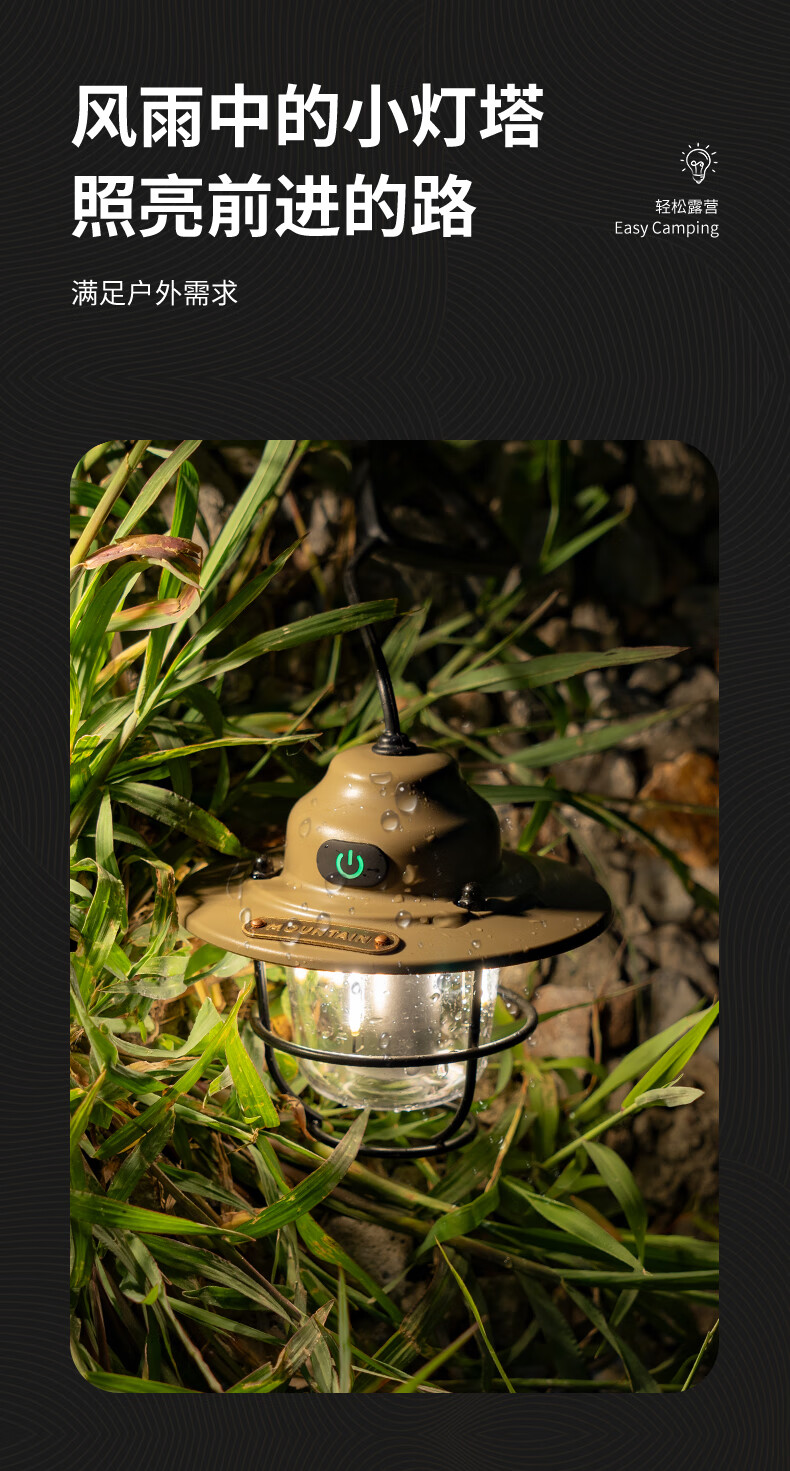 产品材质:有质感且造型独特、大气时尚; 光照强度:能满足四-五人帐篷使用,且不显暗; 续航时间:与产品介绍描述一致,非常耐用; 产品重量:较轻; 电源类型:充电式,与说明书介绍一致。