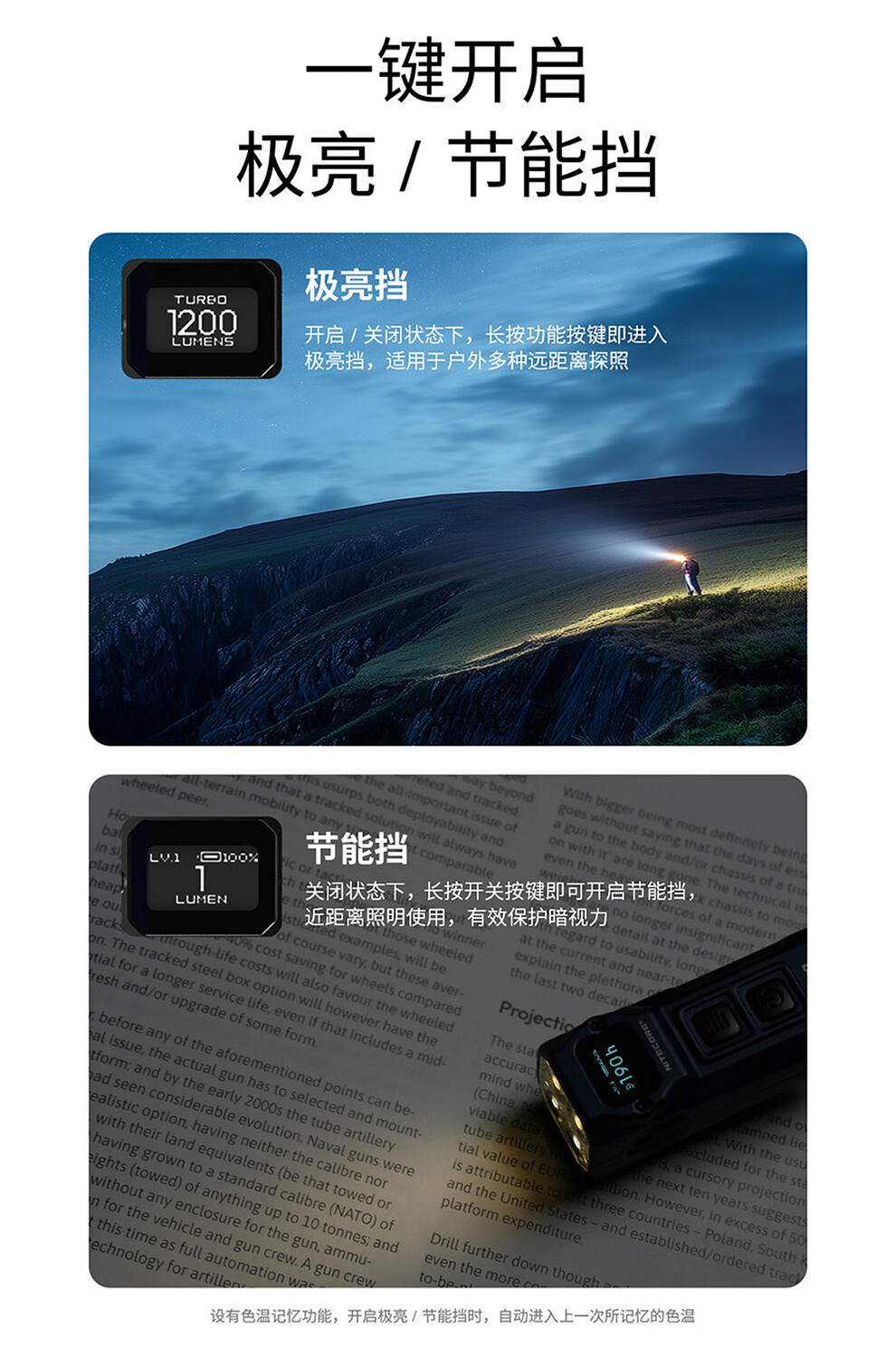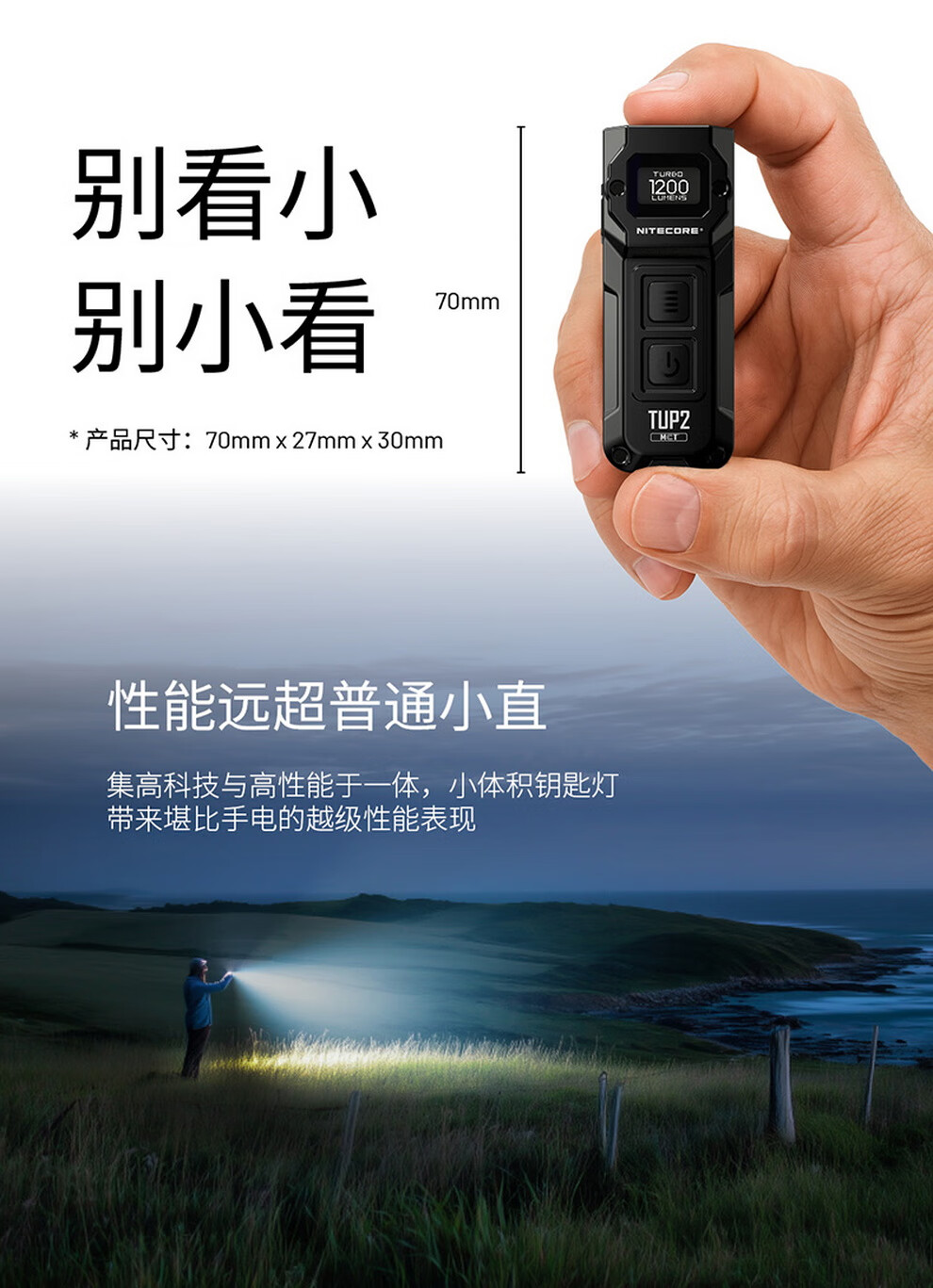 奈特科尔这款钥匙灯很不错,个头比一同买的tini2大一些,但是相对于它1000流明的亮度来说已经是小的不可思议了。搭配LED屏很高大上的感觉。做工精致握感舒适,操作很方便,配合LED查看手电状态很方便,灯亮度也很大。