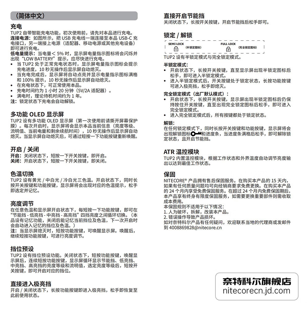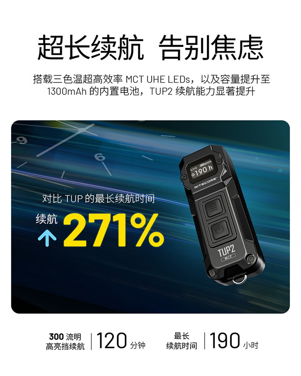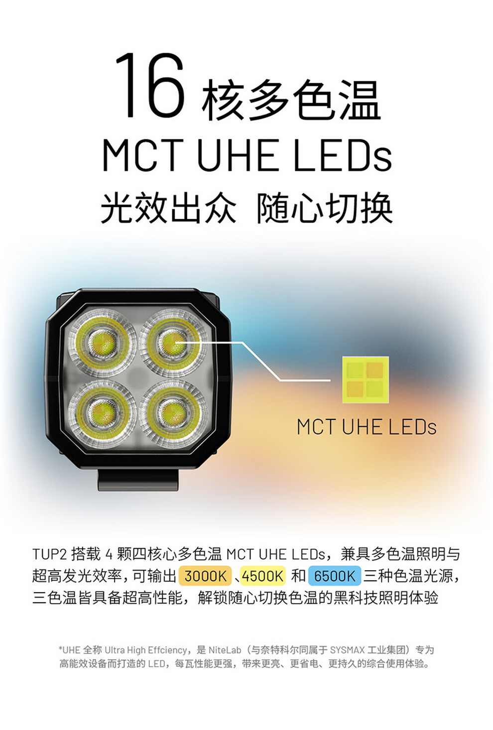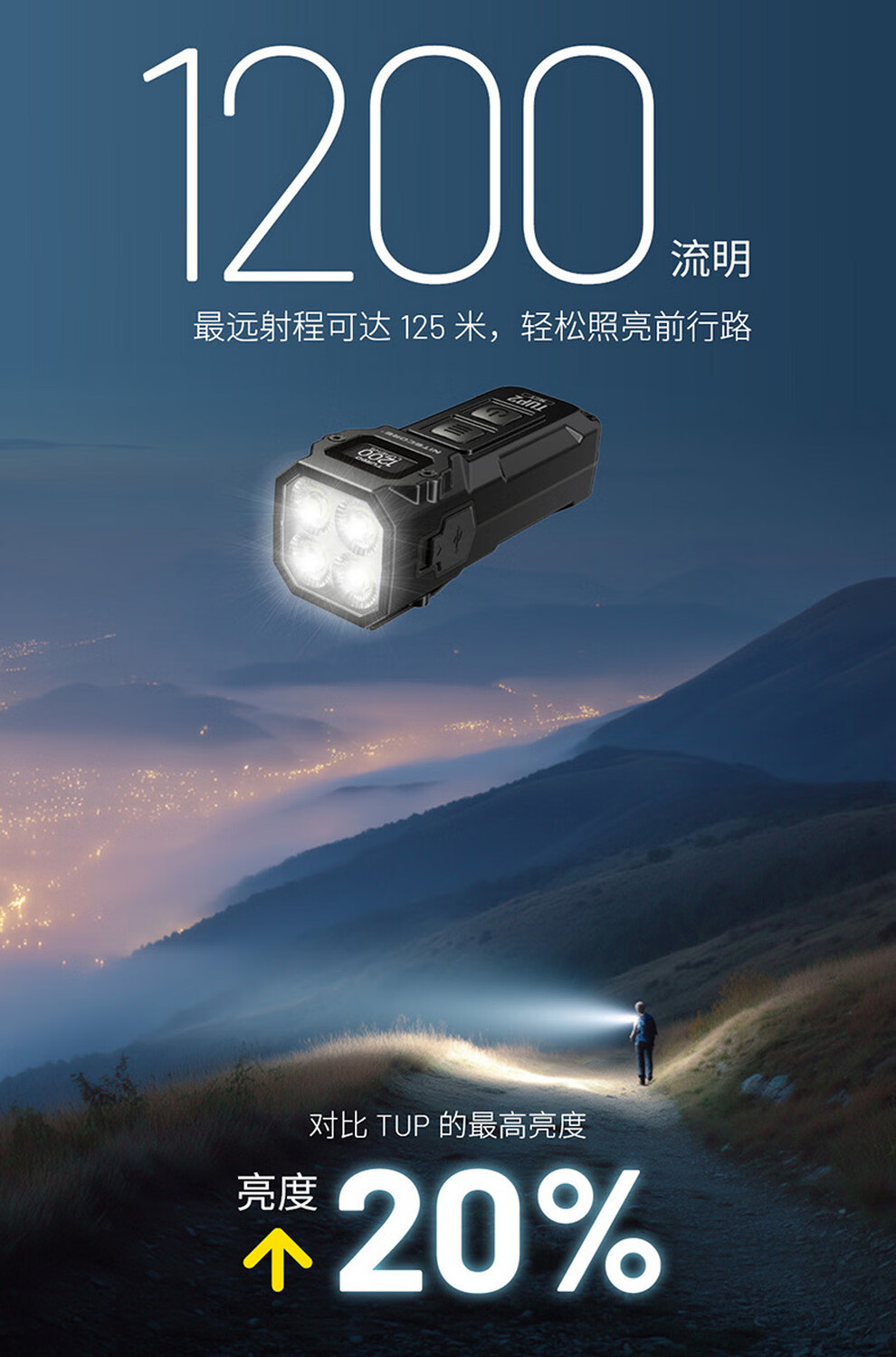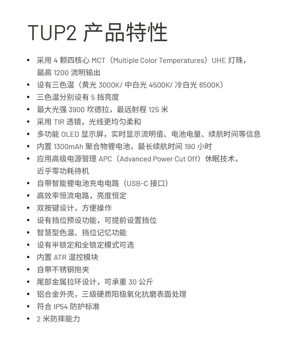 TUP1000这个灯做工精致,防水性能非常优秀,设计的也很小巧,功能也很丰富,亮度也很亮,光照度能达到1000流明,设计多档位也很实用 续航时间:非常长