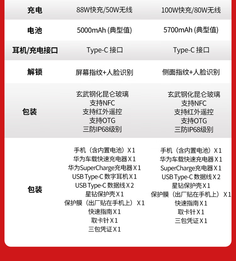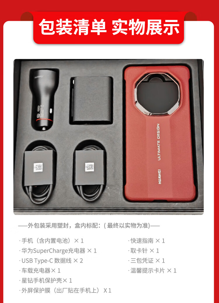 手机(内置电池)*1 华为车载快速充电器*1 华为充电器*1 USB Type-C 数据线*2 星钻保护壳*1 快速指南*1 取卡针*1 保护膜(出厂贴在手机上)*1 三包凭证*1