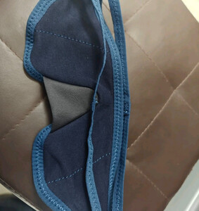 棉布的材料。优点是两侧有两个小口袋,可以收纳耳塞;遮光效果比较好。缺点是带子的长短不能调,戴上比较紧,压眼睛不舒服。这款不适合头围大的人。
