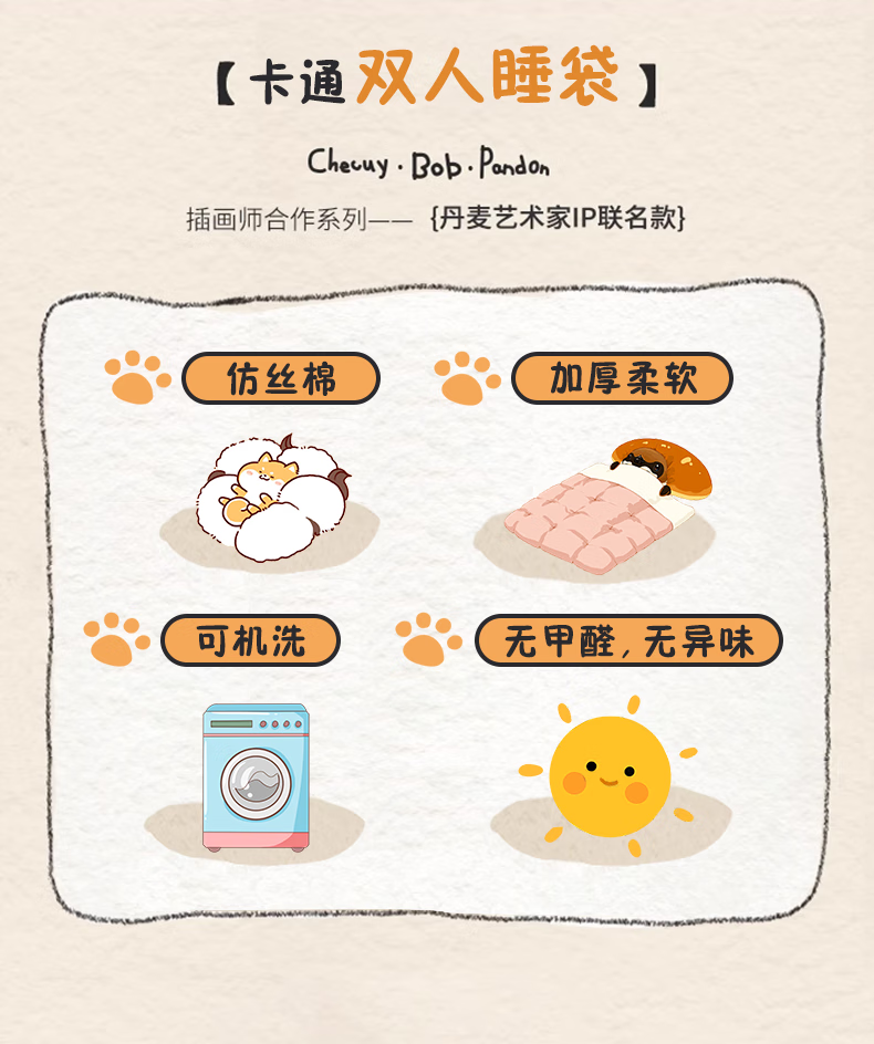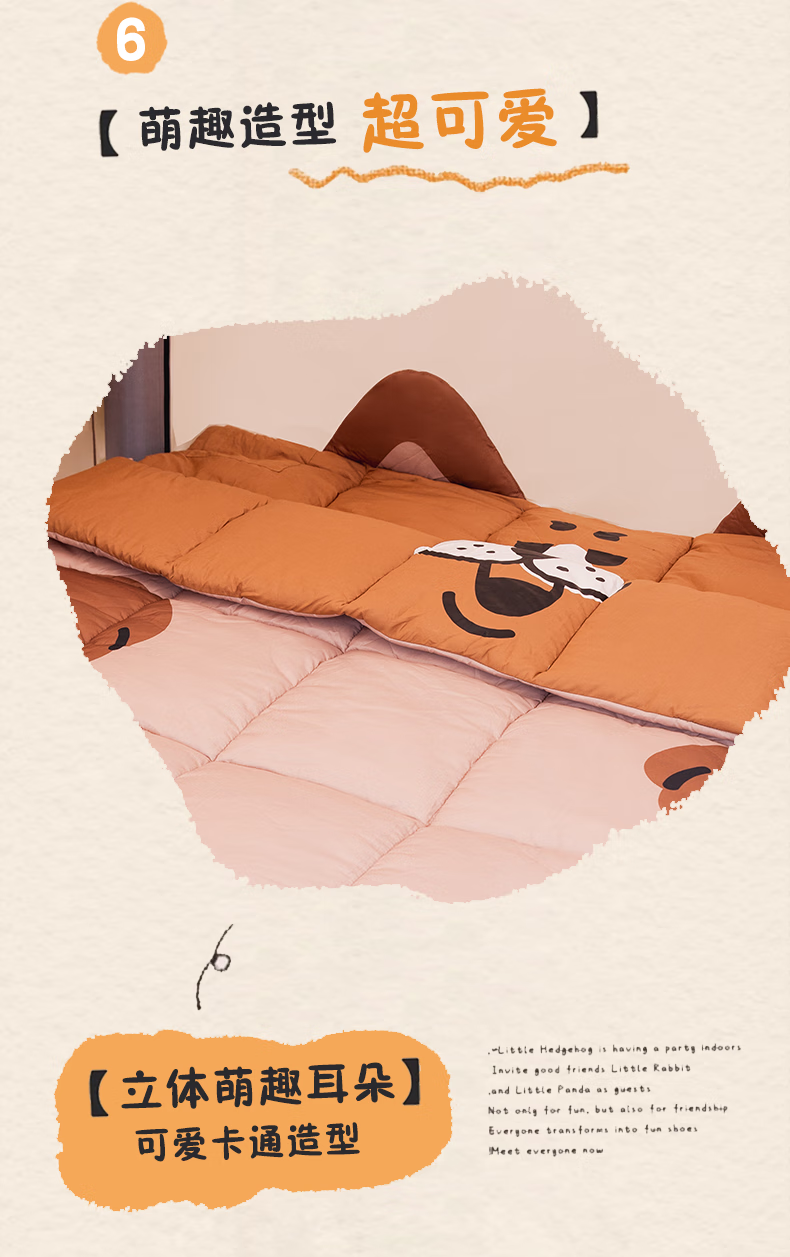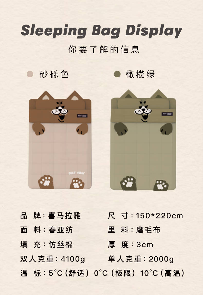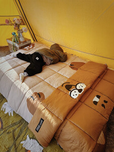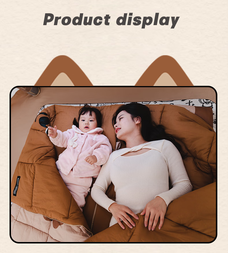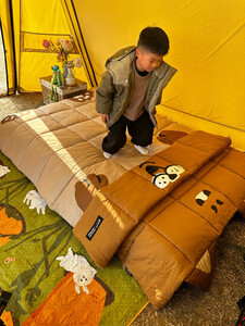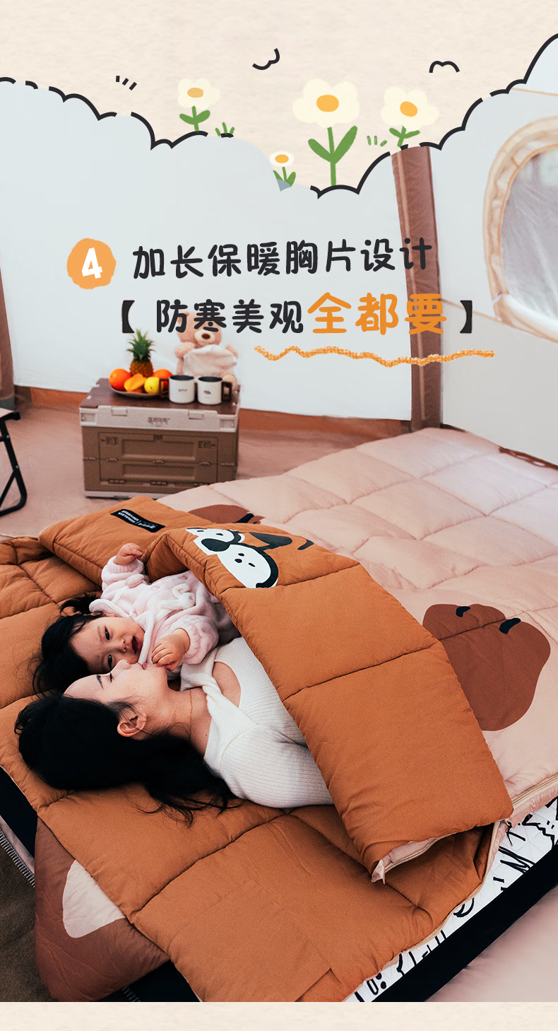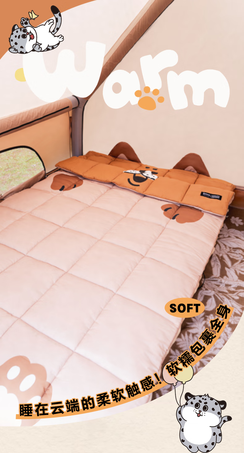 今天带孩子出来玩,小孩很喜欢这个睡袋,他说这个好可爱☺️,一直在上面蹦蹦跳跳,面料也很柔软,我们一家三口睡里面一点不挤,保暖性也超棒,在郊外寒冷的夜晚,我们在里面睡的暖烘烘的,一觉到天亮。这次露营因为它,体验感直线上升。