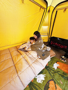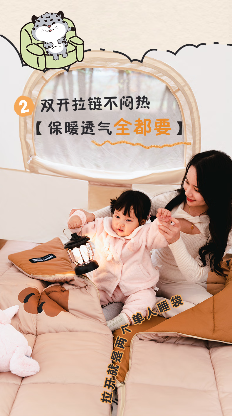 非常好看的亲子款睡袋,睡着空间感非常大,也非常舒适。保暖效果一流,整体来说,使用效果非常棒。放在帐篷里面也是非常的合适,露营睡觉的不二之选。