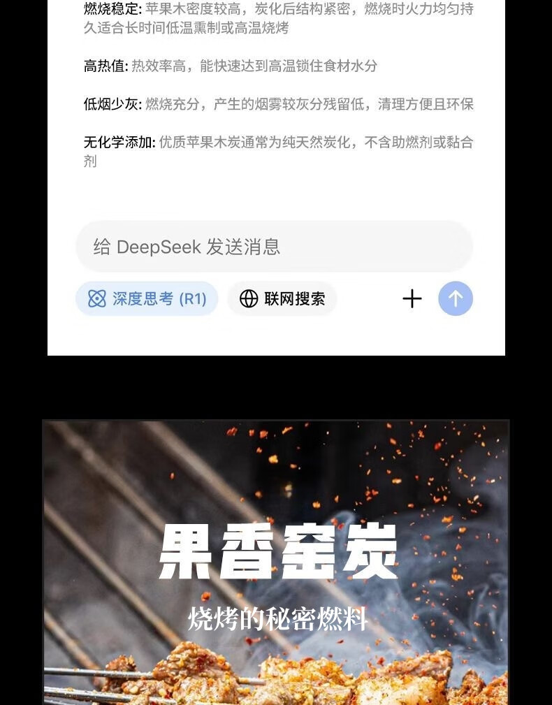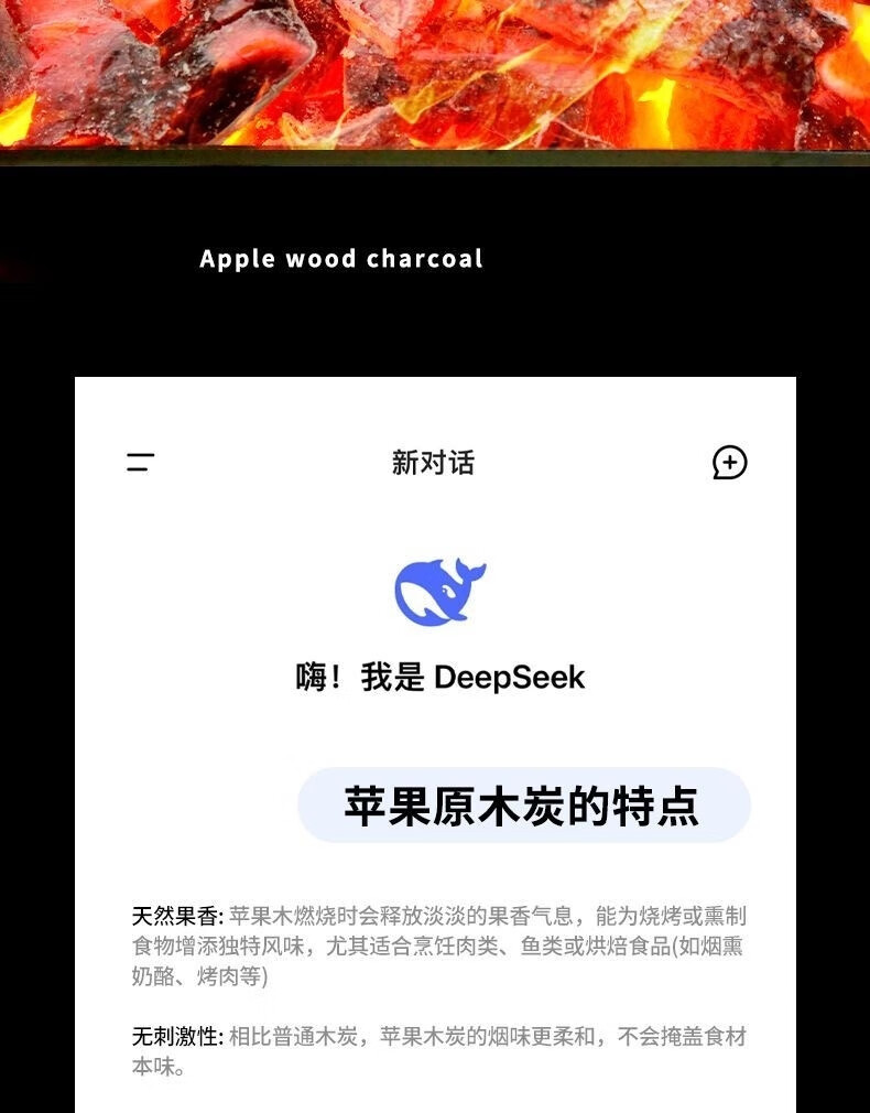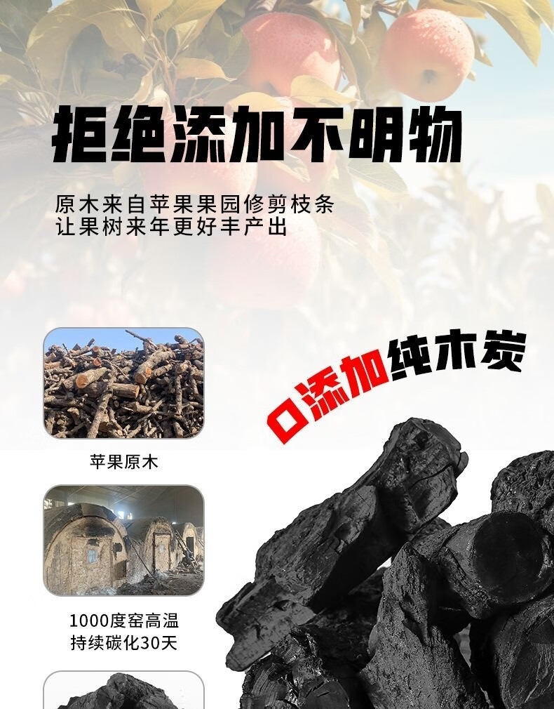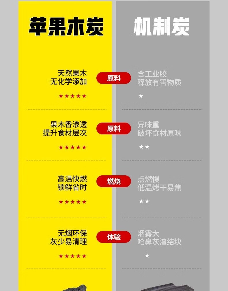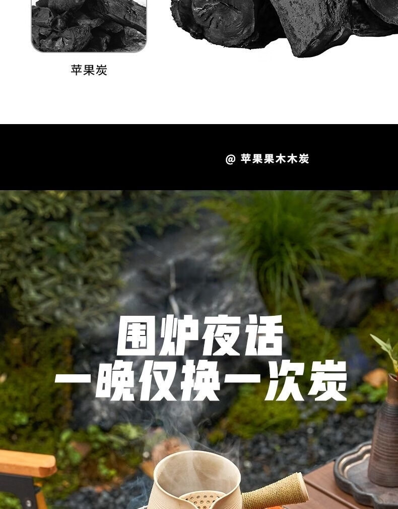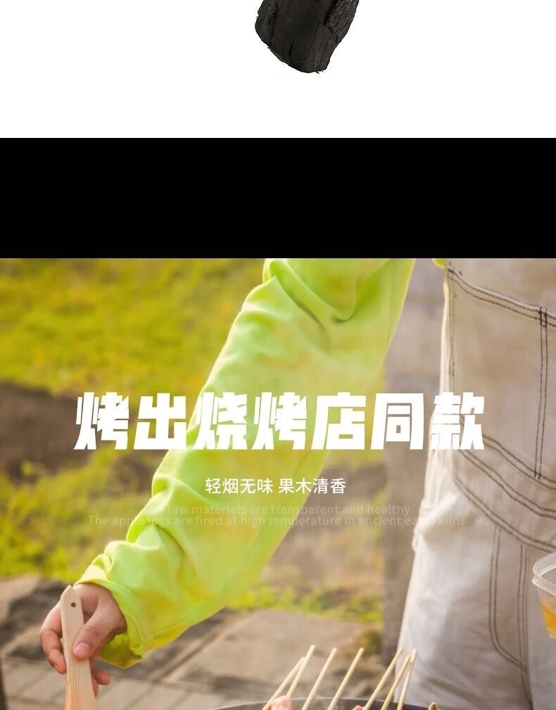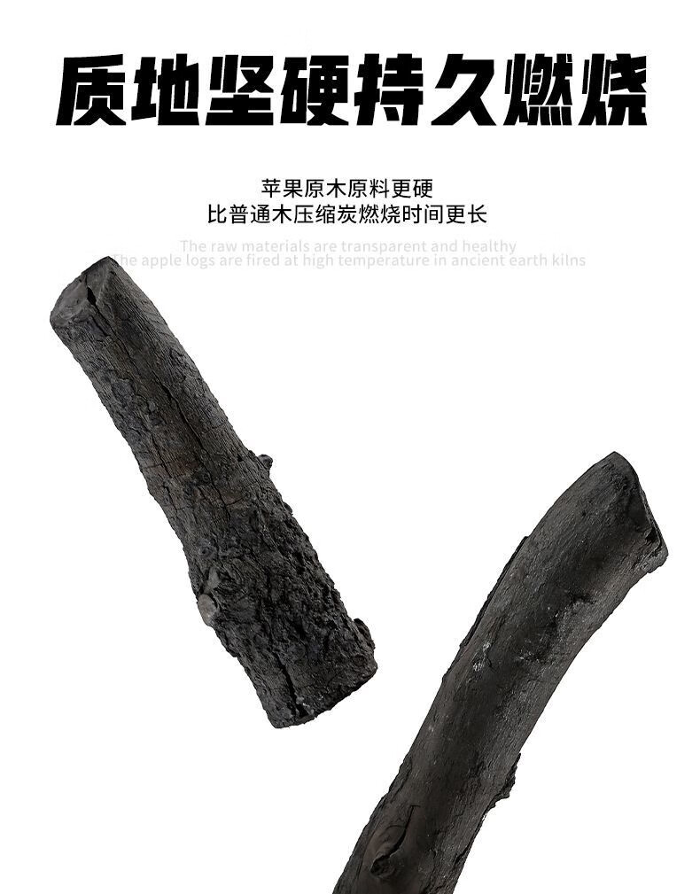 作为引火炭,非常好,燃烧时散发天然苹果香,熏烤食材风味独特;木质密度高,燃烧持久,火力稳定不跳火;灰烬少且易清理,露营后收拾更便捷;天然无添加,烟雾量不是没有,但相对少些