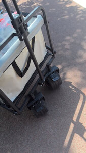 这款推车容量挺大,很能装,特别选了大号轮子,不怕土地,草地陷车,前轮转向,还带刹车,也不怕溜车。颜色也好看,比平常的褐色,黑色,颜值要高!!