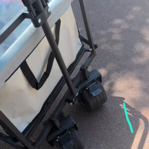 物品收到,物流配送挺快的,包装简陋,纸盒破损,内包装无。一小车4个越野轮子挺好看的有安全感。车架子材料感觉一般200/300斤承重能力可以。推拉杆上半段材料和连接件最好改金属质感或碳纤维,拉杆上下活动不是很爽,估计非金属材料有关系。缝制制作工艺有待改进,针眼孔大的可以透光和透气了。对品牌和质感没有过高要求的可以选择购买。