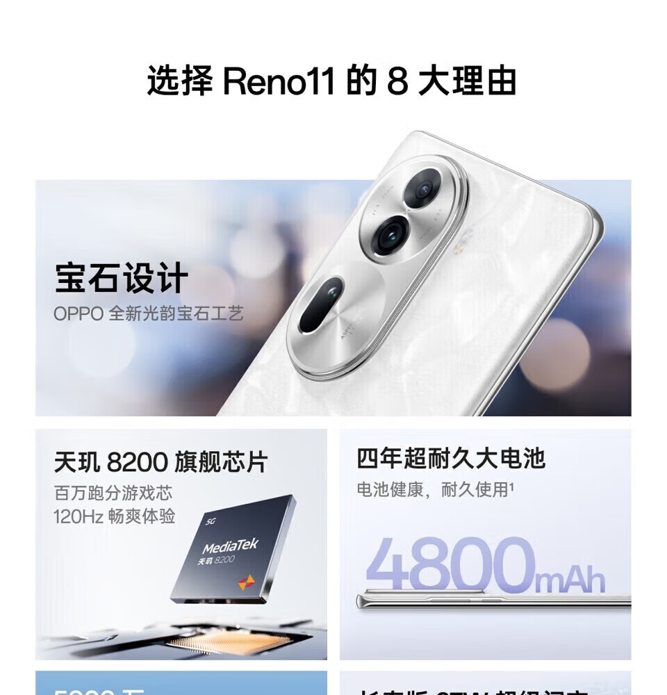 OPPOReno11 天玑8200 游戏机 长续航 5G全网通拍照 AI手机 国行补贴机 萤石青 12GB+256GB