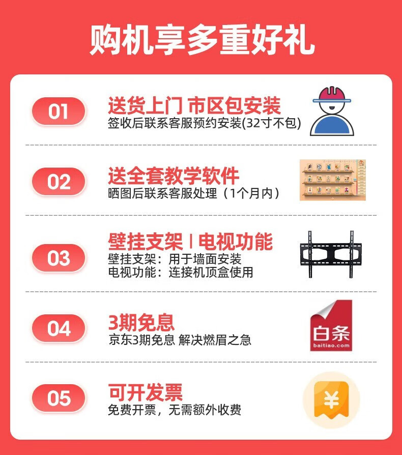产品目前体验很好,还未熟练使用,后续根据使用体验和机器使用过程中有没有出现问题再进行追评吧。 从目前的体验来看: 1.客服服务态度和及时度打满分!也很感谢客服的耐心讲解!有什么问题第一时间回复并解决。 2. 机器功能确实比之前关注的价格低一些的要好,一分价格一分货。 3.厂家发的顺丰快递很快,快递师傅就一个人,75寸特别重,我就搭把手给师傅扶了一下,基本都是师傅自己扛上4楼的,另外两个小一点的本想帮师傅拿一个,但是师傅还是自己坚持要搬上楼,给顺丰的师傅点赞! 4.厂家给找的上门安装师傅人也特别好,第一时间联系上就过来了,由于物件很大,师傅也很耐心,有个刹车轮装好了,我想再换一下调整更好一些的位置,师傅啥话没说就给换了,态度非常好! 总体很满意。期待后续的使用效果!不懂的还得麻烦客服和技术人员哦。