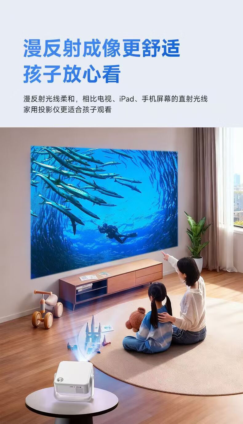 太戳少女心了!!氛围感神器拍照神器结合体!不仅可以随便看各种各样的电视台新闻电视剧之类的,投个照片而已,小卧室立马就氛围感爆棚!手机投屏非常好用,这个功能我经常用哈哈哈哈,一点也不卡!自带的声音也特别赞,听音乐就变成一个好音响了~光是大屏享受和这该死的氛围感,就足以让我疯狂安利了!小小一个放床尾投影,非常喜欢!必须点亮五颗小星星
