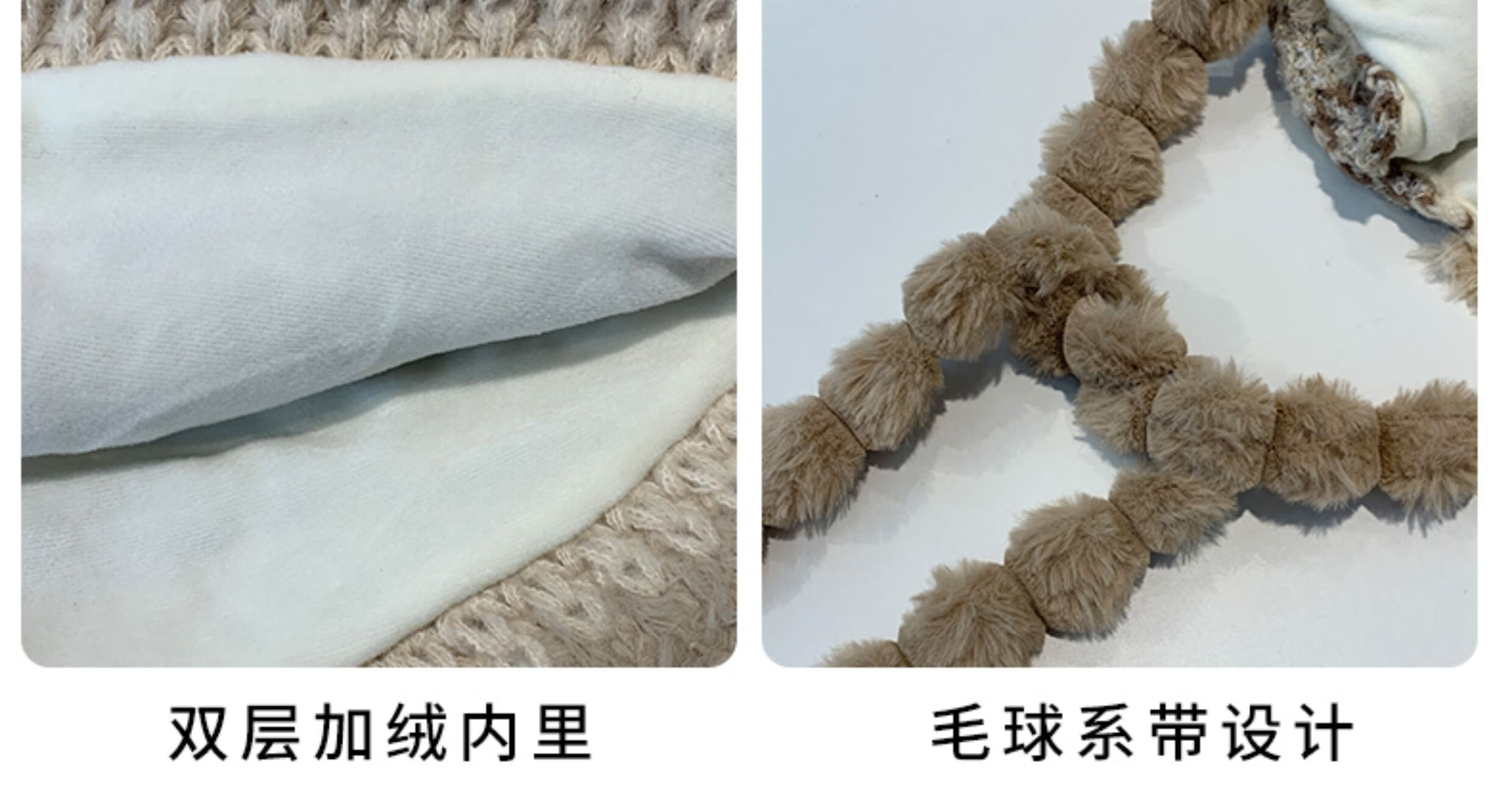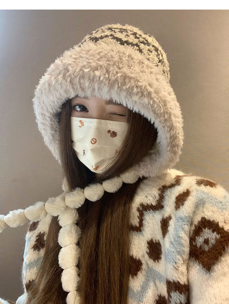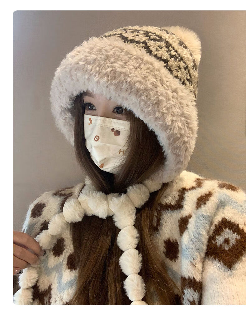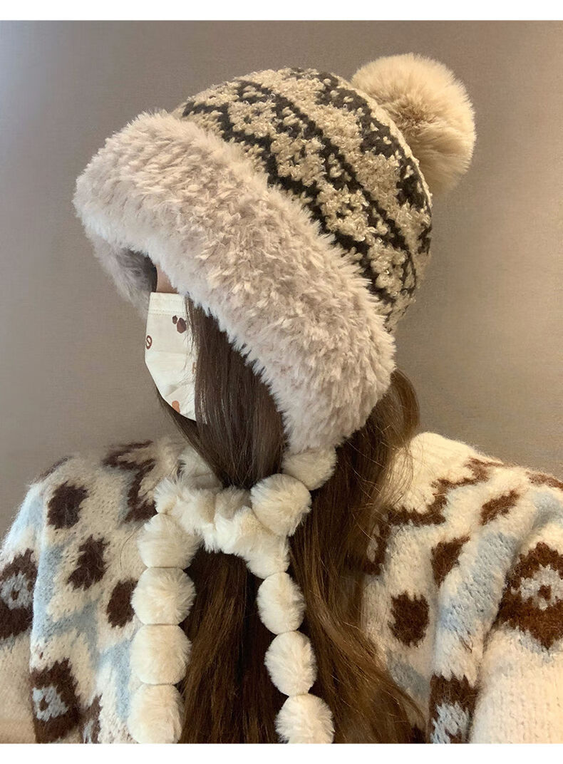 2025新款毛绒帽子女秋冬季保暖风耳针织帽骑车加厚寒毛线帽 米色 成人均码 加绒加厚