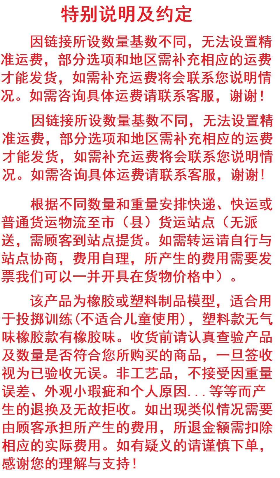 该产品为橡胶或塑料制品模型,适合用于投掷训练(不适合儿童使用),塑料款无气味橡胶款有橡胶味.