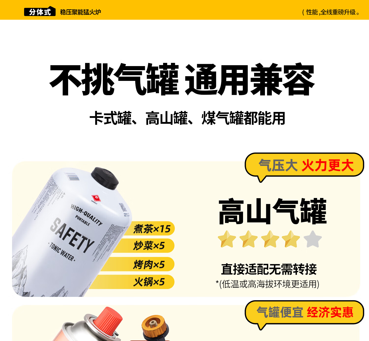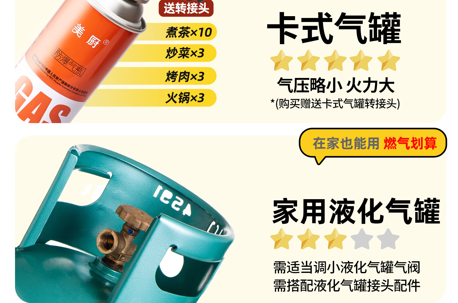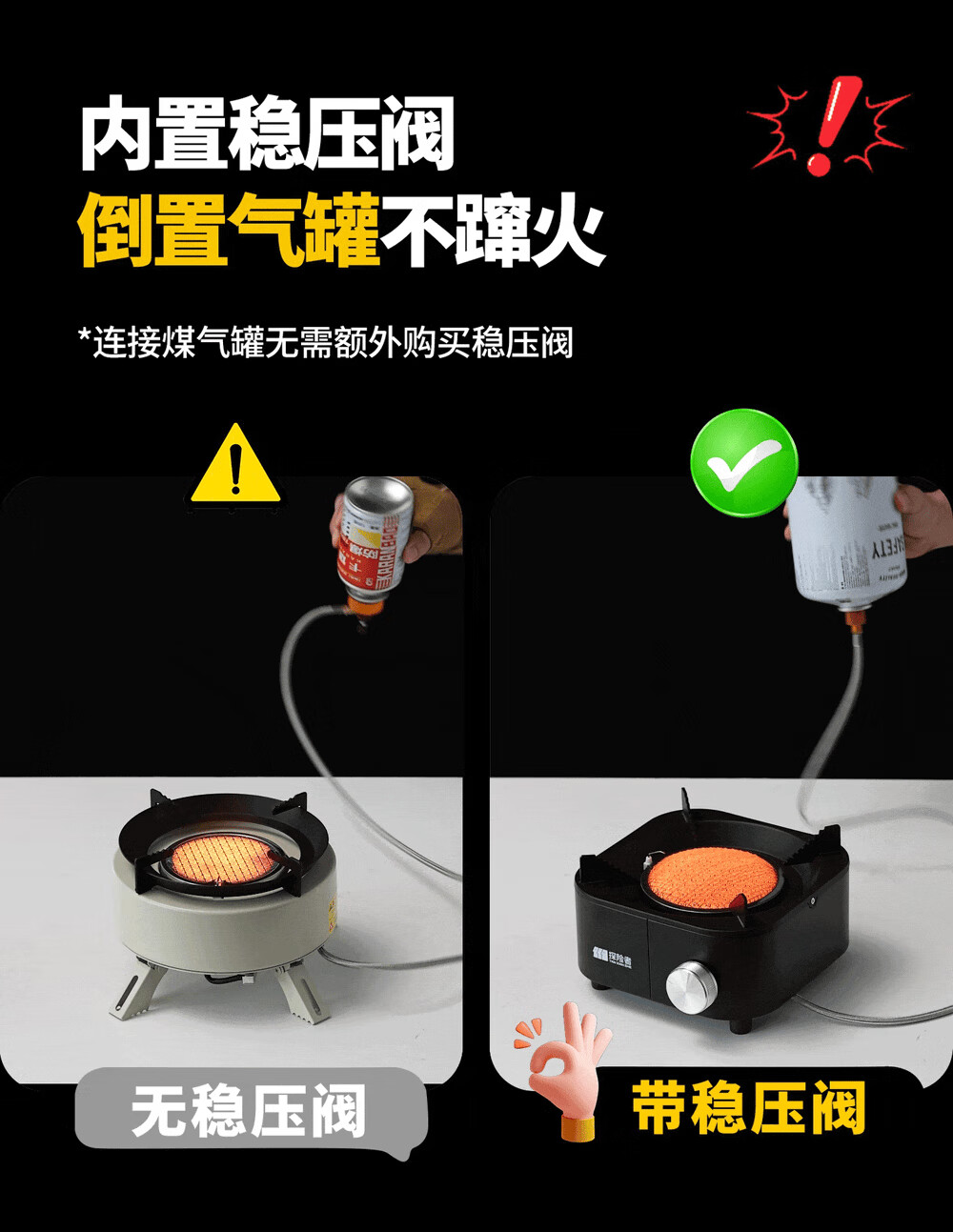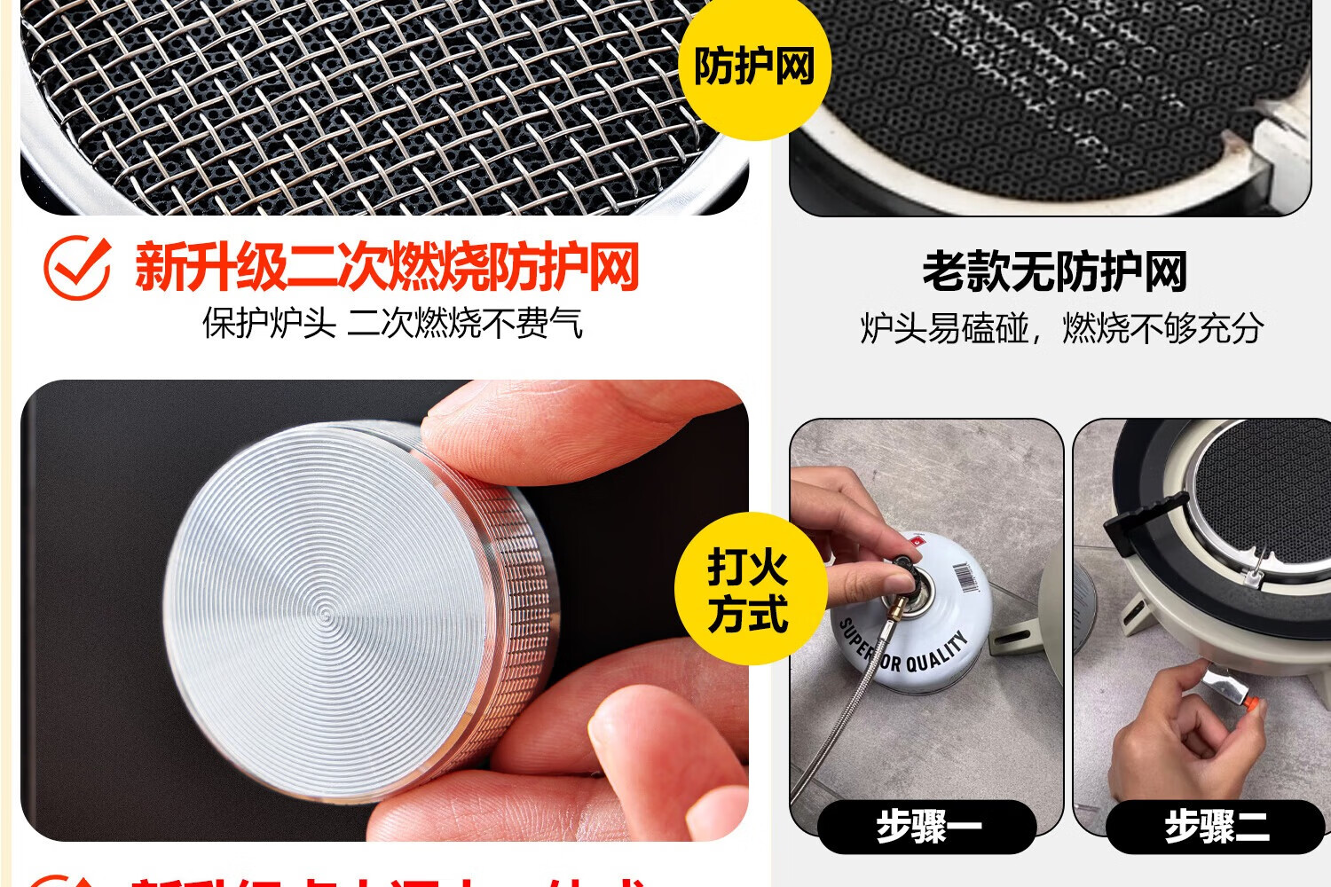 买了两种款式,一种明火一种暗火适用不同使用场景,都自带电子打火,送有卡丁罐转接头,大小罐通用。火力虽没商品页里展现那么大,但也算够用了,都设计了防风炉沿,对小风有一定效果,价钱不贵,总体满意