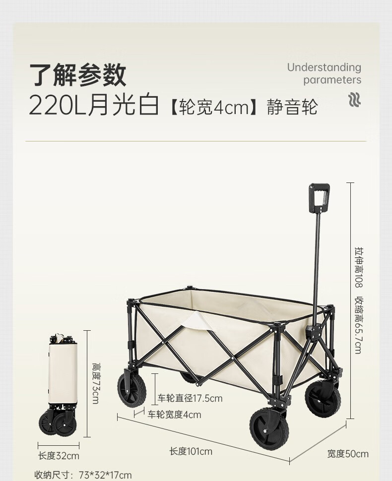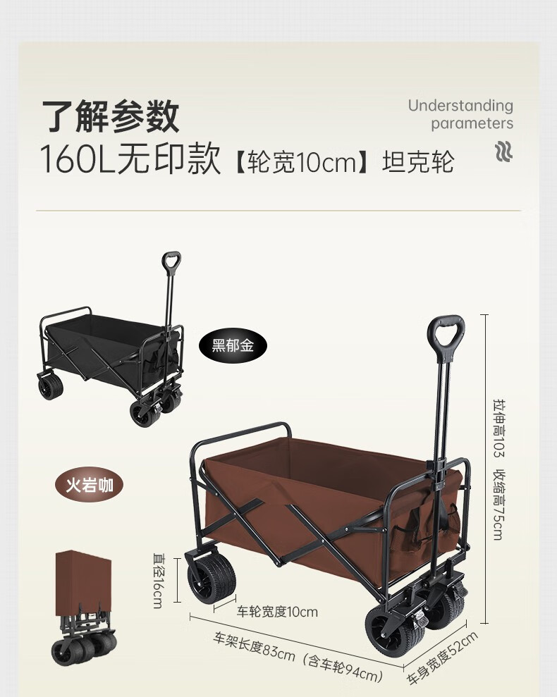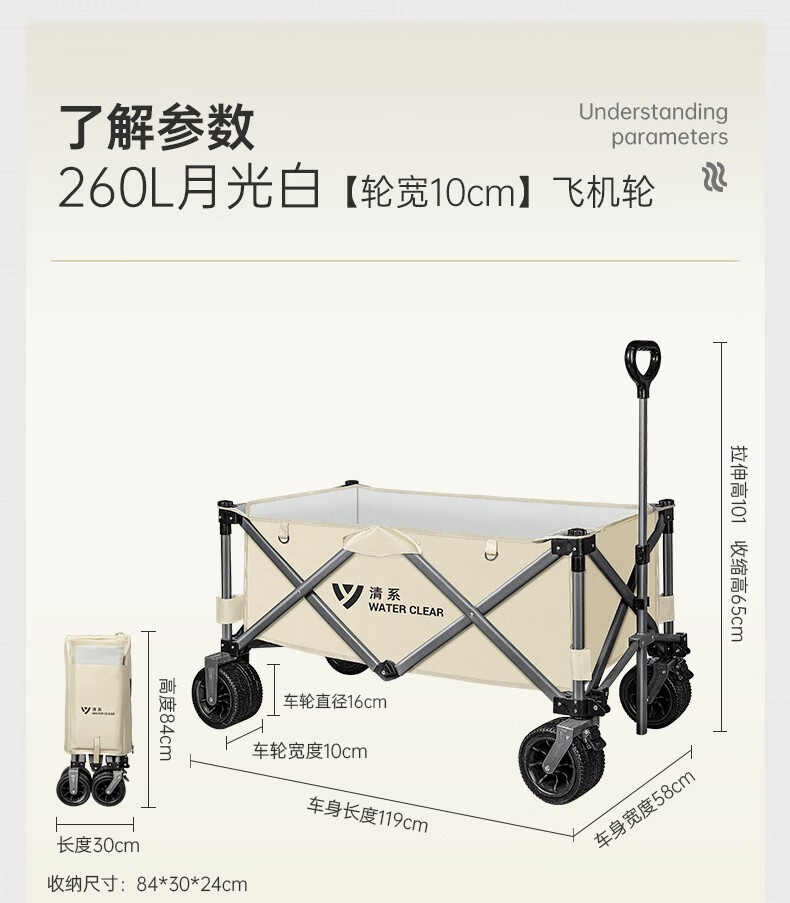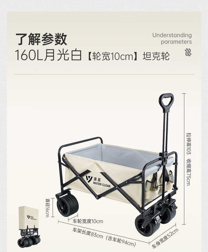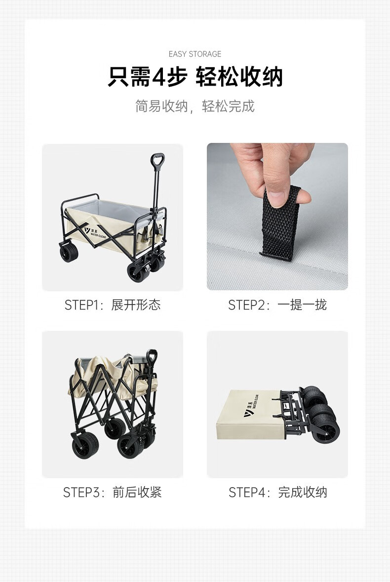 清系 户外露营折叠车野餐车营地车露营装备便捷拖车推车购物旅游买菜 180L 有刹车 黑色越野轮
