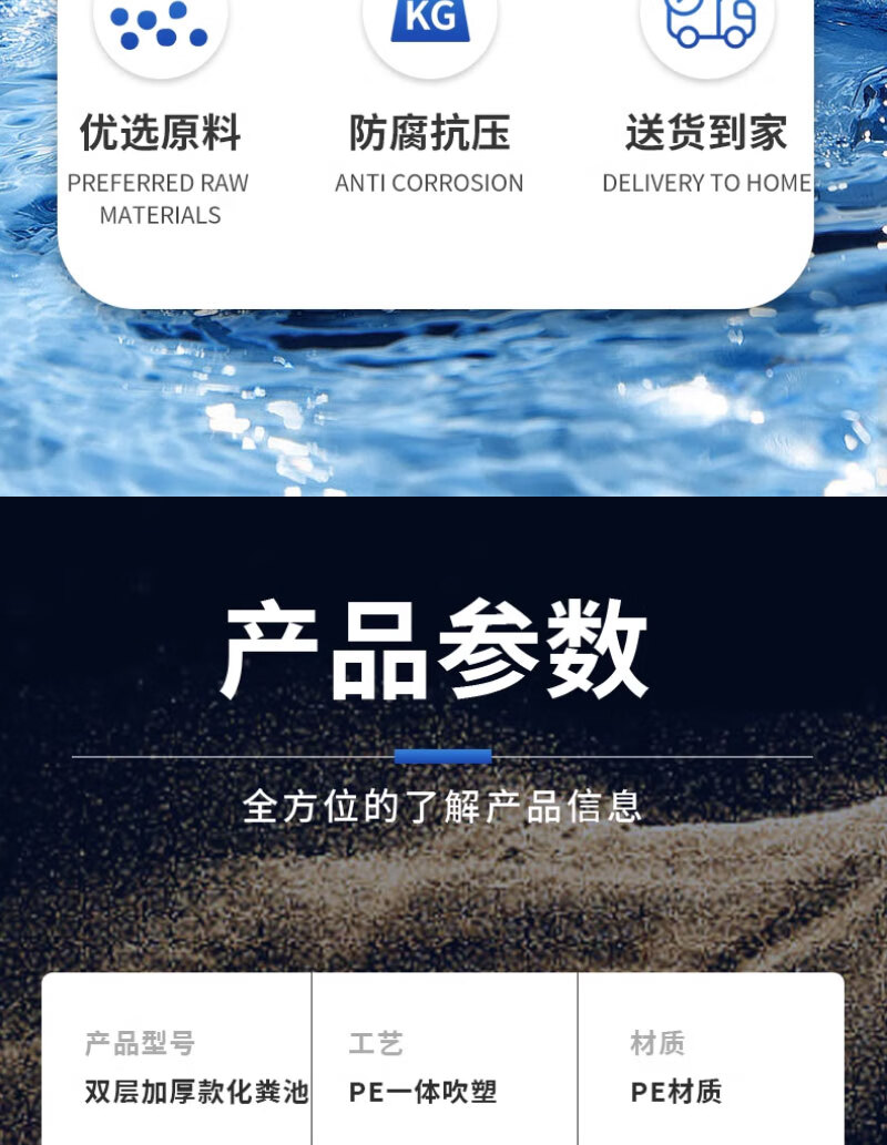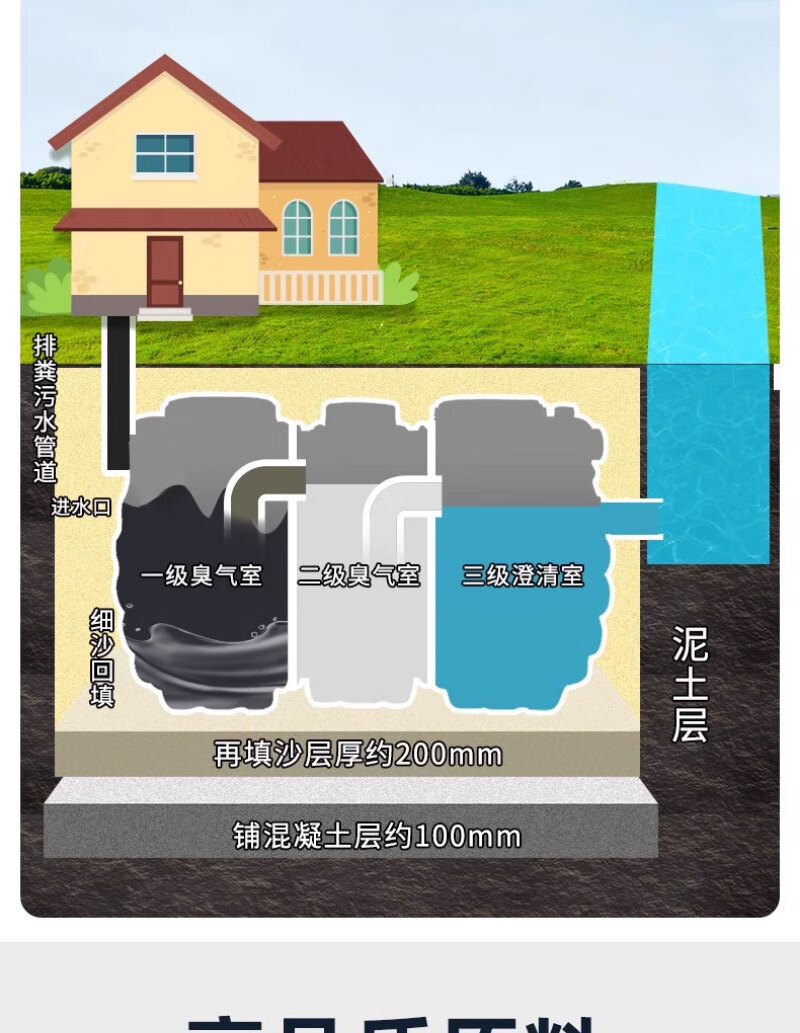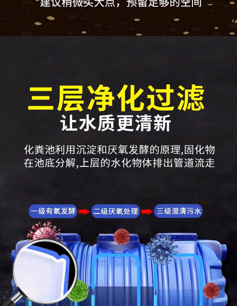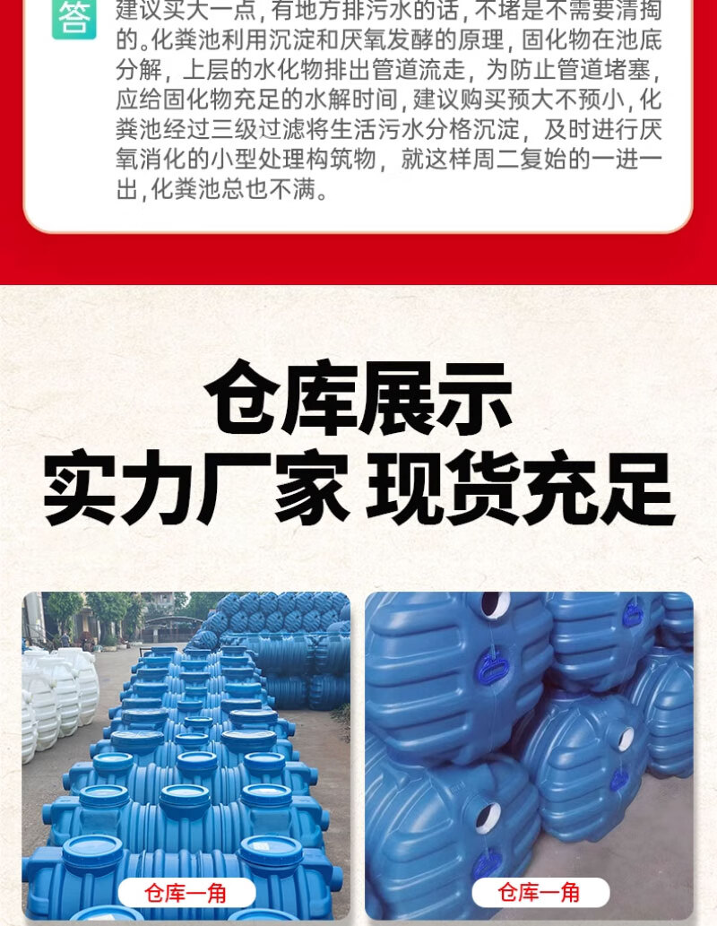 这款化粪池很不错哦,材质也不错,一家人空间够用,1.2个方,可供三十人使用,买过的人都知道,安装很方便,还送了两个直通,快递哥也给力,直接送货入户,给个大赞!