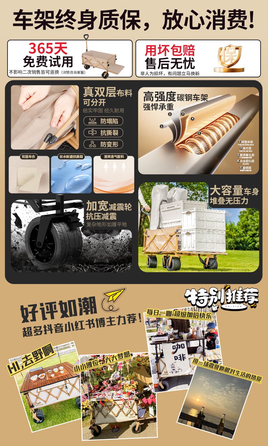我的第一张露营车!好多朋友摆摊都是用这个牌子的!我也买了!!客服态度超好!!(夸夸) 组装老简单了。而且质量同价位我觉得真没得能打的,我都能整个人躺在桌板上