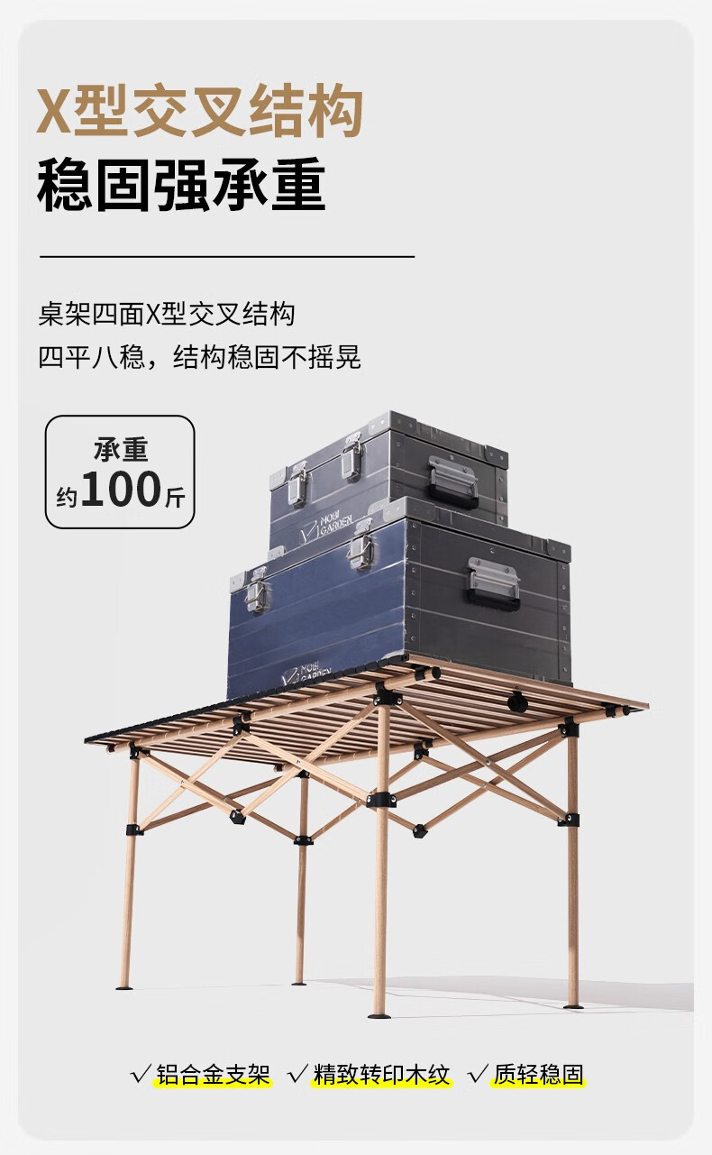 牧高笛蛋卷桌铝合金折叠桌户外露营桌椅套装超轻便携式野营野餐桌子山享 原木色/M号【X型结构 山享】