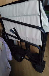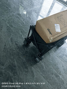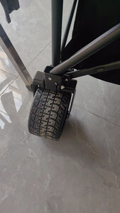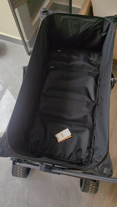 黑色的露营手推车还不错啊,承重150斤肯定没问题,车架和轮子看着也还可以啊,轮子挺大的,过沟沟坎坎的方便,就是没轮子刹车,黑色衬布很单薄,很廉价的感觉,两头的衬布看着有点赃,有点磨损发白,看着有点旧呢