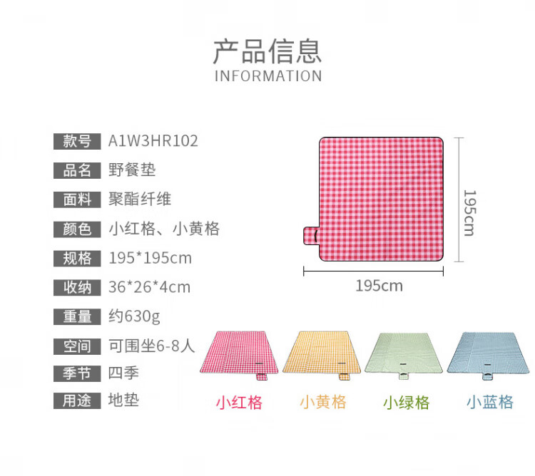 注:A1W3HR102蓝格,195×195cm(牛津布) 可以折叠成手提的样子,无单独的收纳袋