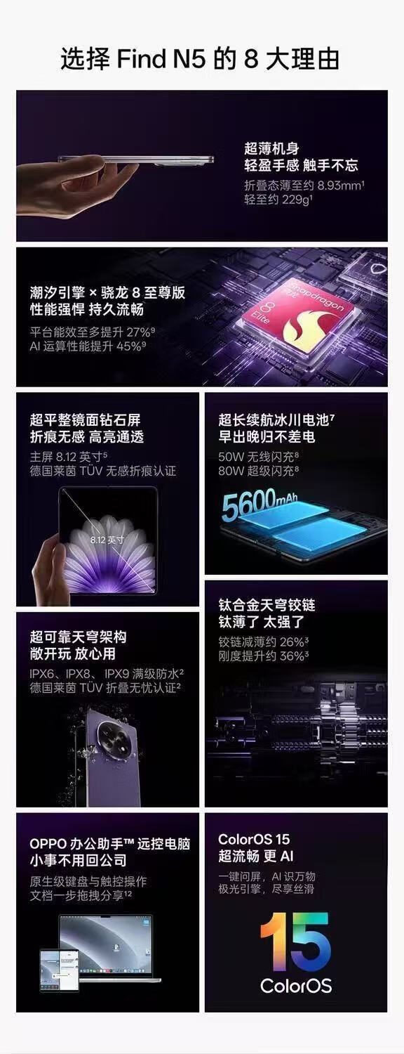 OPPO展机Find N5 AI机身 超长续航 骁龙8版 折叠屏手机 玉白 16GB+512GB