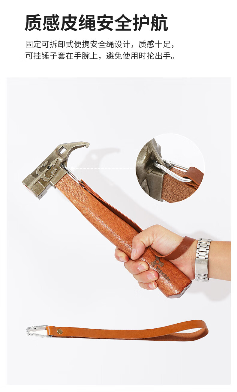 一次完美购物。优点: 1、造型优美,就像一件艺术品; 2、铸造精确,棱角圆润; 3、担心锤把没有穿透整个锤子,固定不结实。实际锤把和锤孔连接紧密,应该是烘干后的锤把再强力挤进锤孔内;锤子侧面还有铆钉将锤把与锤子进一步锚固; 4、防脱皮带和锤子活扣连接,可以随时取下; 5、锤子重量,锤头大小及起钉等功能完全满足要求。 缺点: 稍微有一点点小贵。