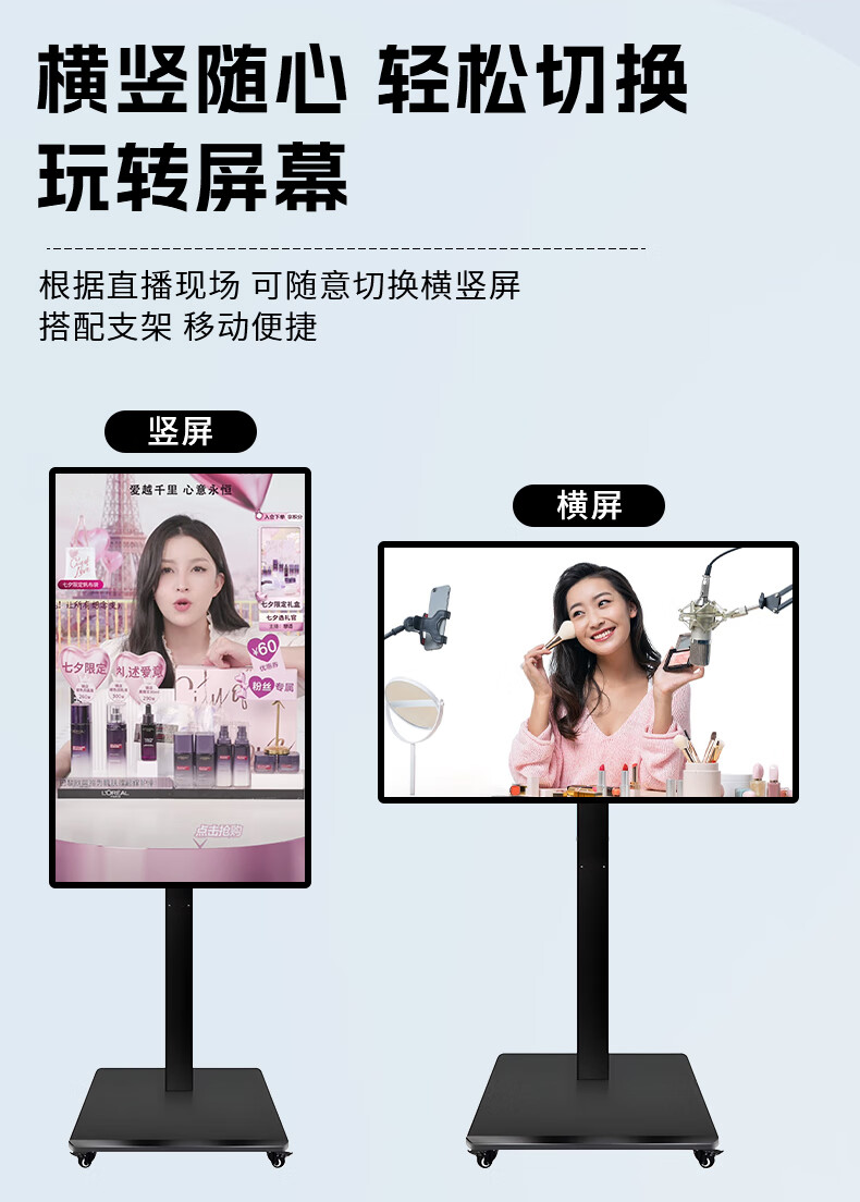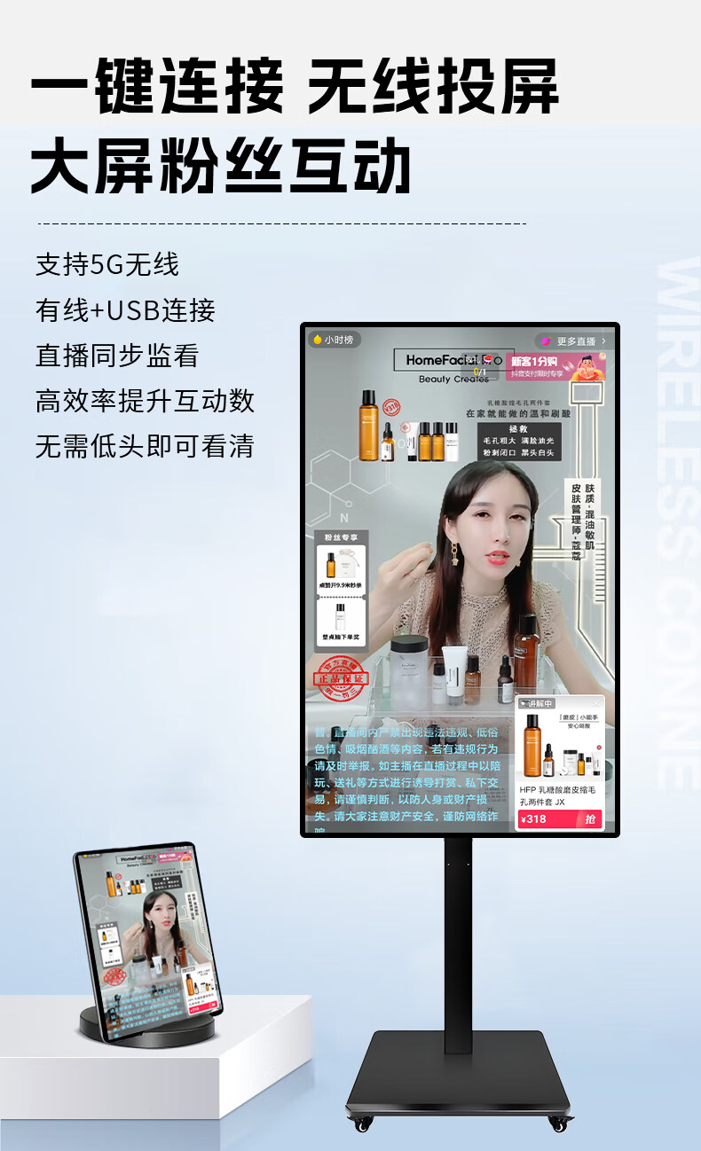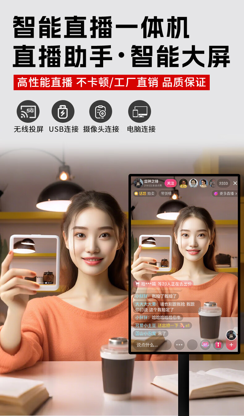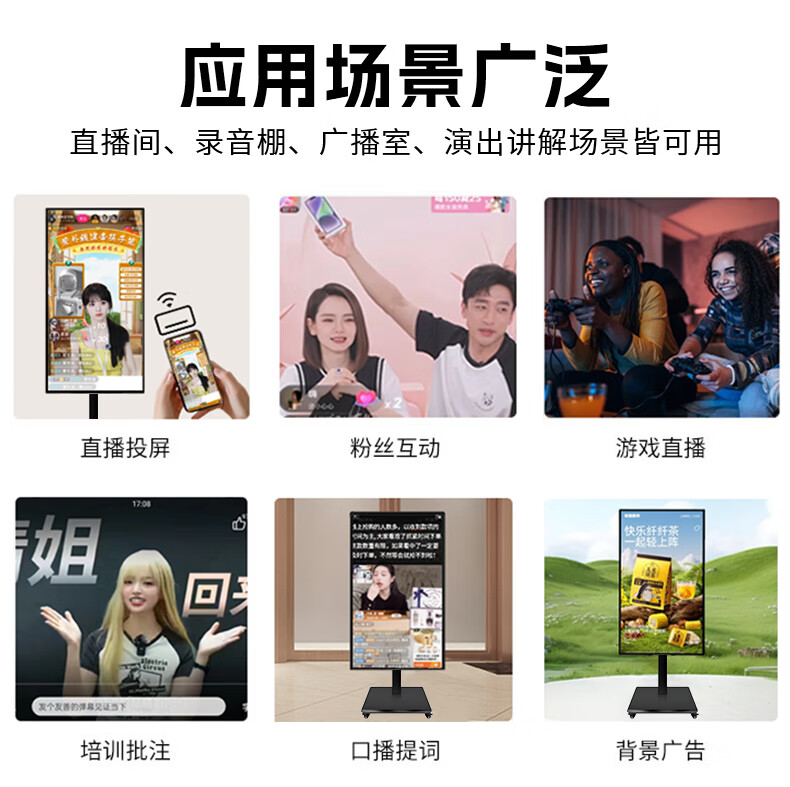 价格实惠,功能强大,可以用手机投屏,跟粉丝互动画面更清晰,还有提词器不怕直播忘词了哈哈,直播时也很流畅,直播没开始时时间段还可以放到店门口宣传,效果也很棒