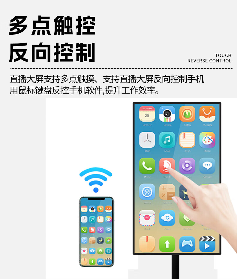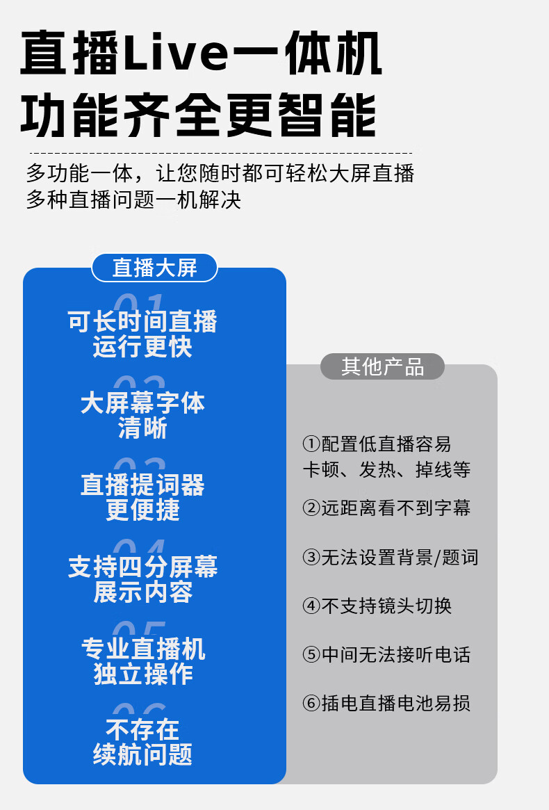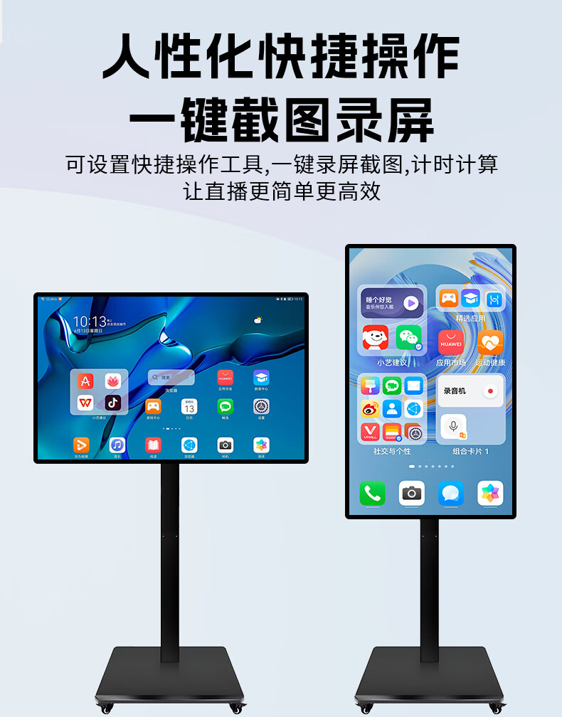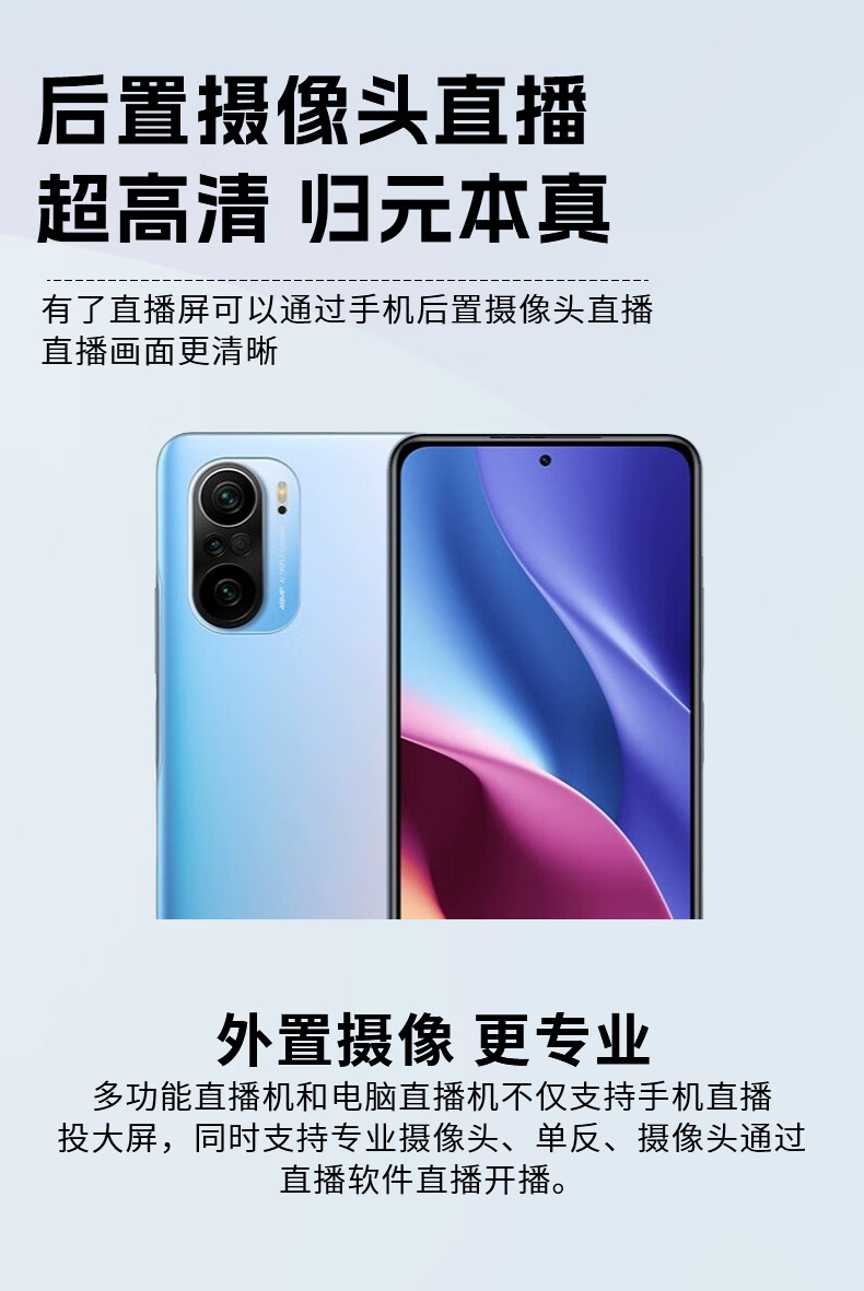 价格实惠,功能强大,可以用手机投屏,跟粉丝互动画面更清晰,还有提词器不怕直播忘词了哈哈,直播时也很流畅,直播没开始时时间段还可以放到店门口宣传,效果也很棒