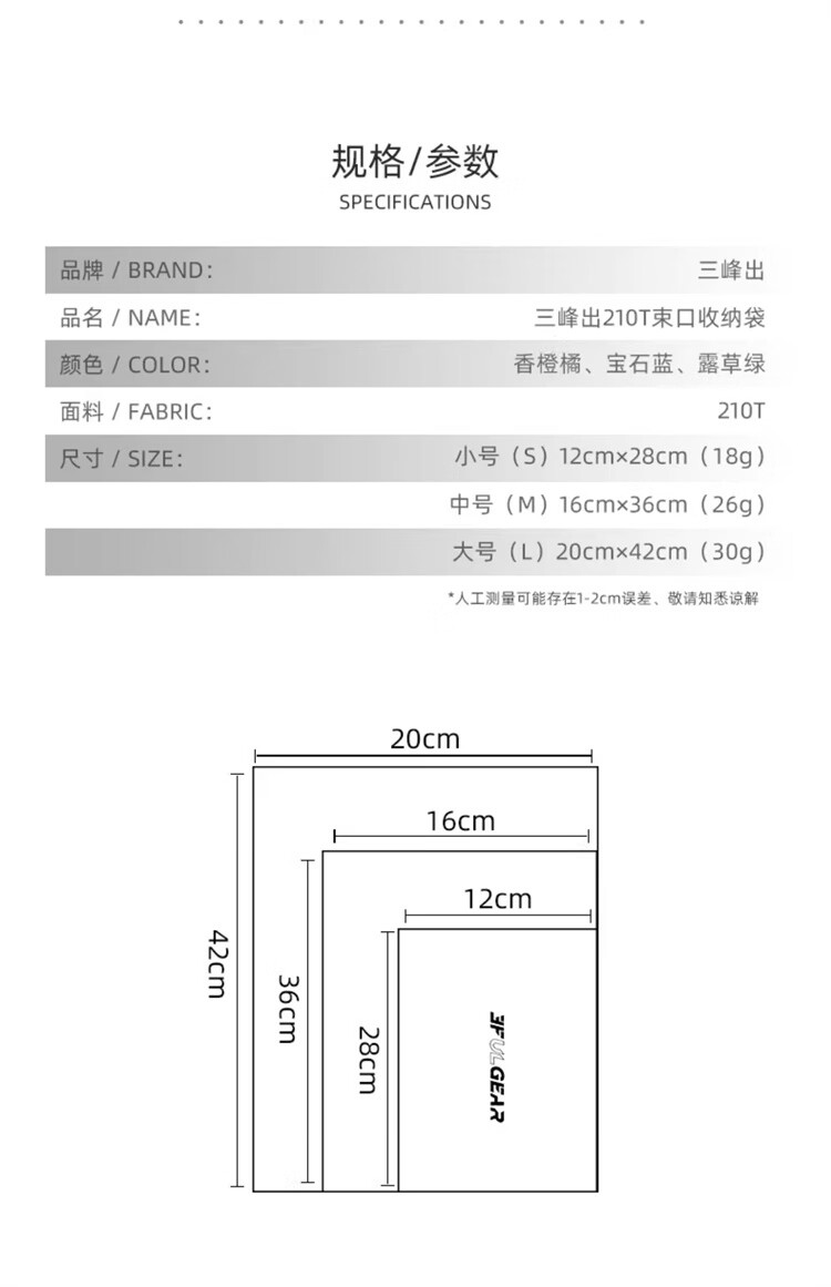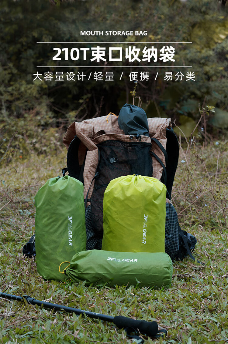 三峰出户外收纳袋旅行圆底抽绳束口袋多用途衣物打包收纳整理袋杂物袋 210T 大号(20X42cm)颜色随机