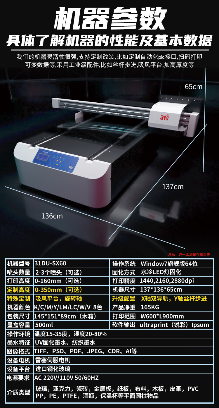 31DU-SX60 UV打印机 一台 墨水一组 8色 软件及配件一套 圆柱功能或者水晶标功能 (联系客服)