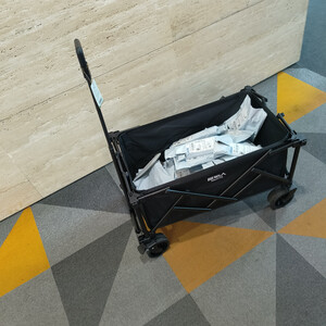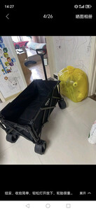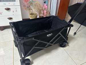 一开始买来主要是先搬家用的,容量挺大挺能装。折叠起来很方便,从中间一提就折叠了,折叠后占地方不大,但是重量不轻,因为车架是钢管材质,如果想重量轻的话,可以选择铝合金车架的,肯定会轻不少,那也意味着载重量也会下降,根据自己需求来选择吧。展开后车挺大,结实耐用,上去一个成人,稳稳当当的。四个轮子是宽胎的,挺实用,过个减速带很轻松。拉手能够自动回弹,这个挺好。拉手抽拉方式类似拉杆箱的,材质是硬塑料,这点不太好,拉重物的时候不敢太用力,怕拉断,需要后边有人推一把。总体来说挺好,毕竟价格不算高。