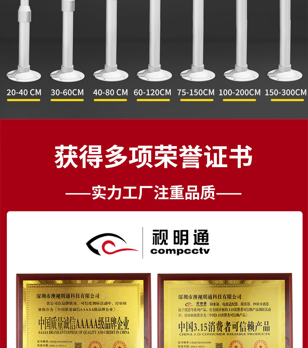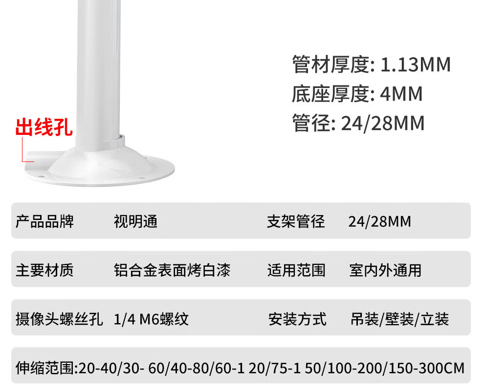 视明通 监控摄像头伸缩加长支架铝合金墙壁吊装室外万向架子 伸缩范围:20-40cm 带萤/石底座