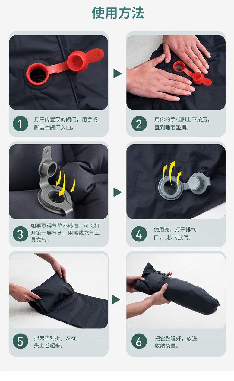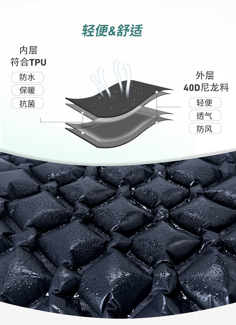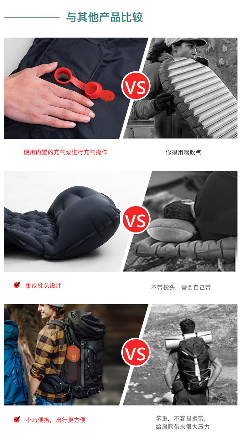 对比了几家最后选了这款,充气速度很快,收纳也方便,不占地方。躺上去软硬适中,支撑感不错,户外露营用了几次都没漏气,质量靠谱。重量轻背着走远路也不累,性价比挺高的!