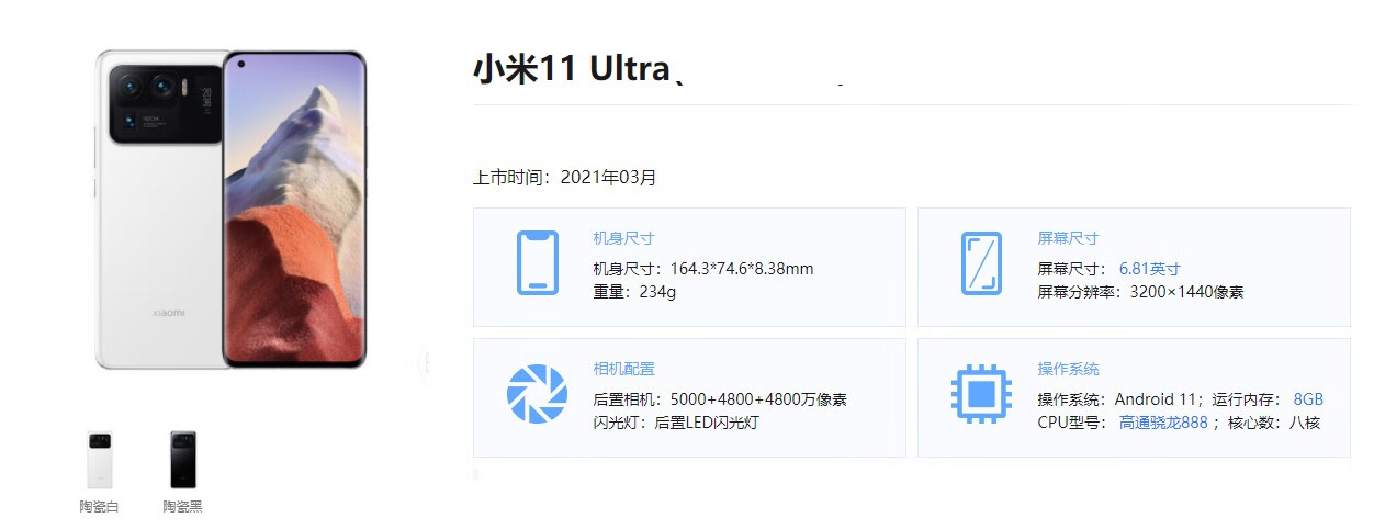 小米11 Ultra版5G通曲面屏骁龙888陶瓷手机 陶瓷白 12+128GB(95xin)成色