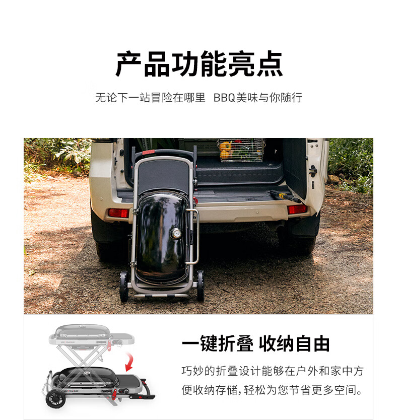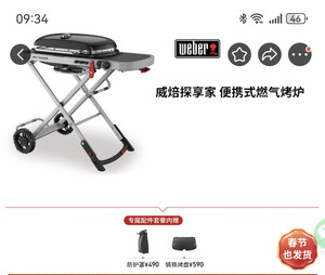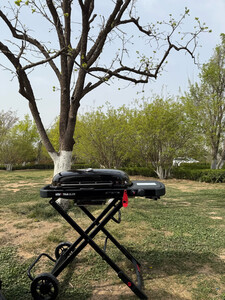 由于院子不大,炭炉烟雾较大,所以选择了weber的这款小巧,便捷的气炉。外观颜值也还可以。 组装只需要组装车轮部分即可。收纳时只需要拉下把手就可以了,落地后会炉体部分会自动上锁。打开也非常方便,不需要额外再花时间组装。 推荐购买额外烧烤炉选配的配置:气瓶(必须,原装不带),收纳包(方便车载)。 重量大小:一位成年男性完全足够提着跑。 热源类型:气瓶(推荐大瓶的,需要预热) 便携性能:收纳完成后占用空间很少,非常方便放置。外出是,普通suv后备箱可搭载。 室内室外:适合室外