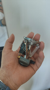 超轻量级钛支架,收纳后就和一根烟差不多,很方便,就是卡底座的时候提醒下不要完全打开卡,很难卡,要三支脚稍微打开一个弧度然后卡进气罐底部,然后再把支架完全打开,从气罐取下来的时候也一样,先收缩到一个小的弧度再直接拿下来