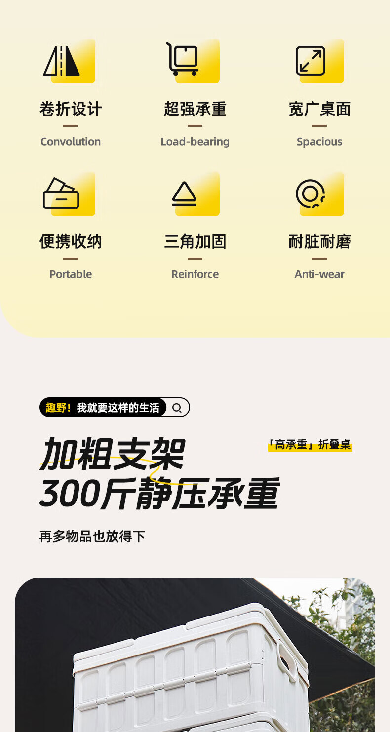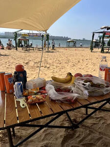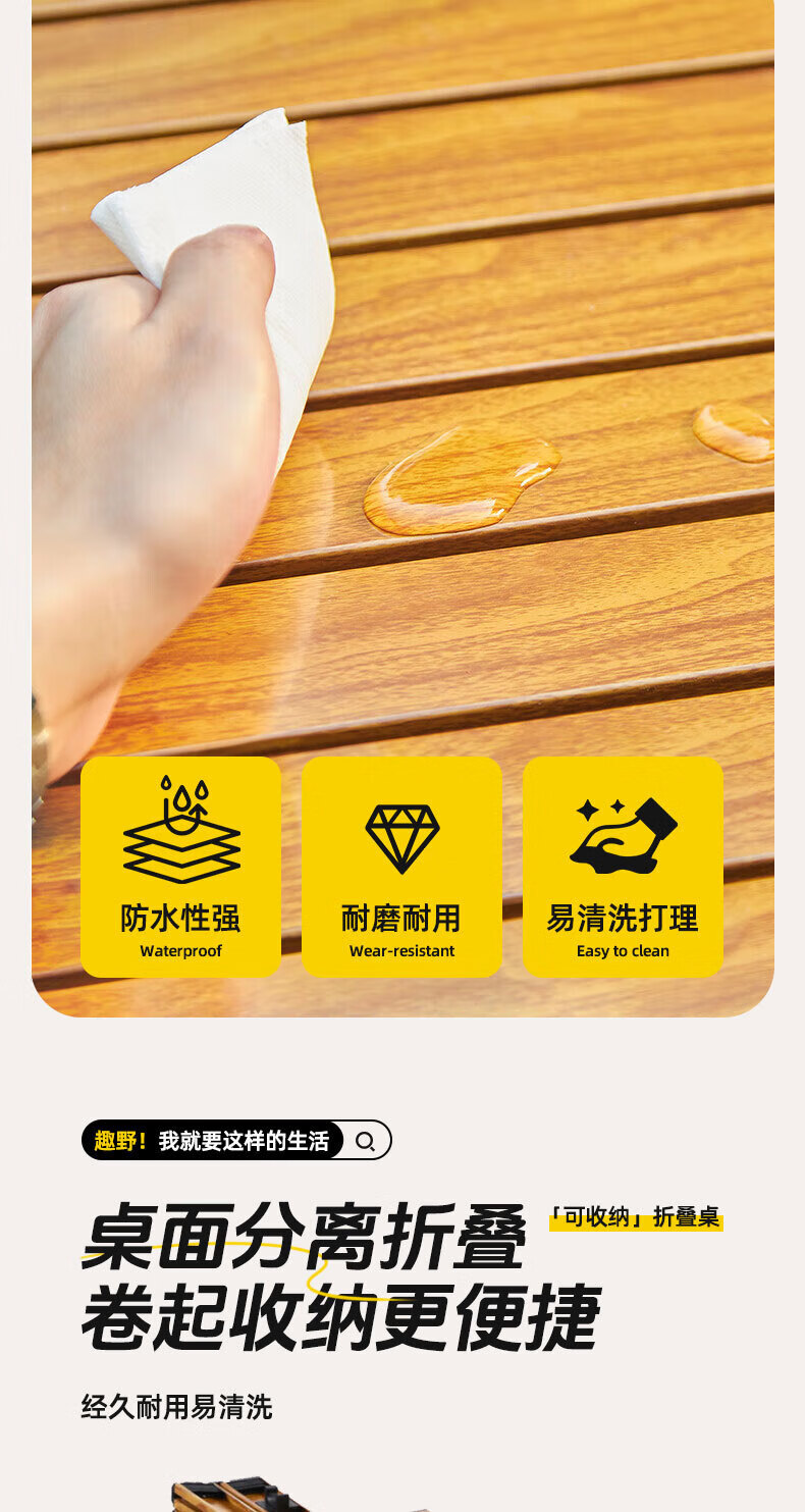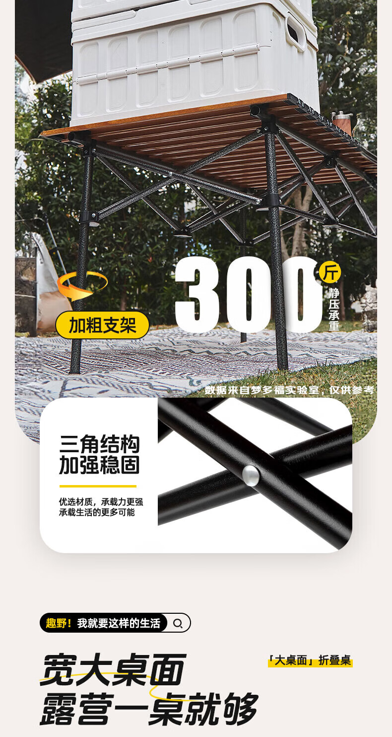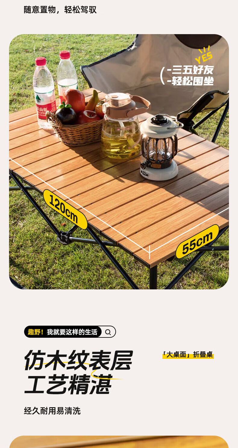 铝合金材质超轻便,出门露营轻松携带。展开和收纳超简单,几秒钟就能搞定,完全不费事儿。它桌面宽敞,摆放食物、饮料、餐具都绰绰有余 ,加粗加厚的支架,稳固承重,承重力超给力。而且它防水防污,沾上食物残渣,用湿纸巾轻轻一擦就干净。颜值也超高,和露营帐篷搭配起来氛围感拉满,拍照超上镜!有了它,露营幸福感直线上升,强烈推荐!