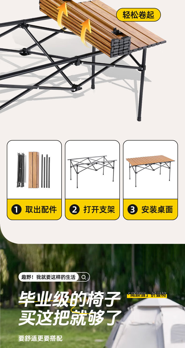 这款户外折叠蛋卷桌真是露营神器!铝合金框架轻便又结实,安装折叠超省心,女生单手也能操作,很快就可以装好。。桌板卡扣设计稳固承重强,放火锅烤盘都不晃。磨砂桌面防滑耐磨,收纳后仅背包大小,野餐郊游带着超方便。颜值简约高级,桌面质感非常好,椅子也结实,布料透气耐磨,出去玩用了好几次了。朋友见了都问链接!性价比高,绝对值得入手!