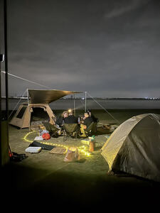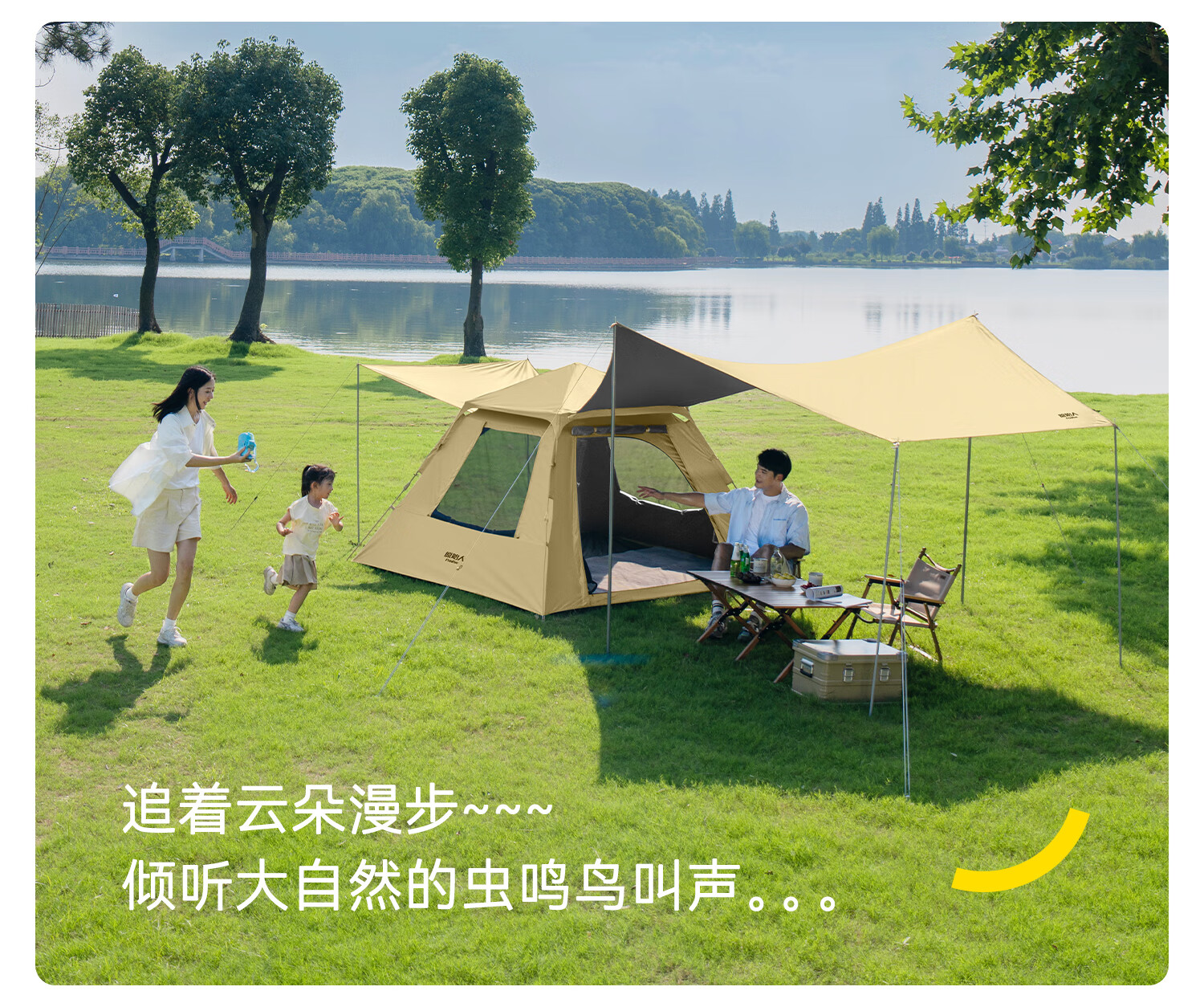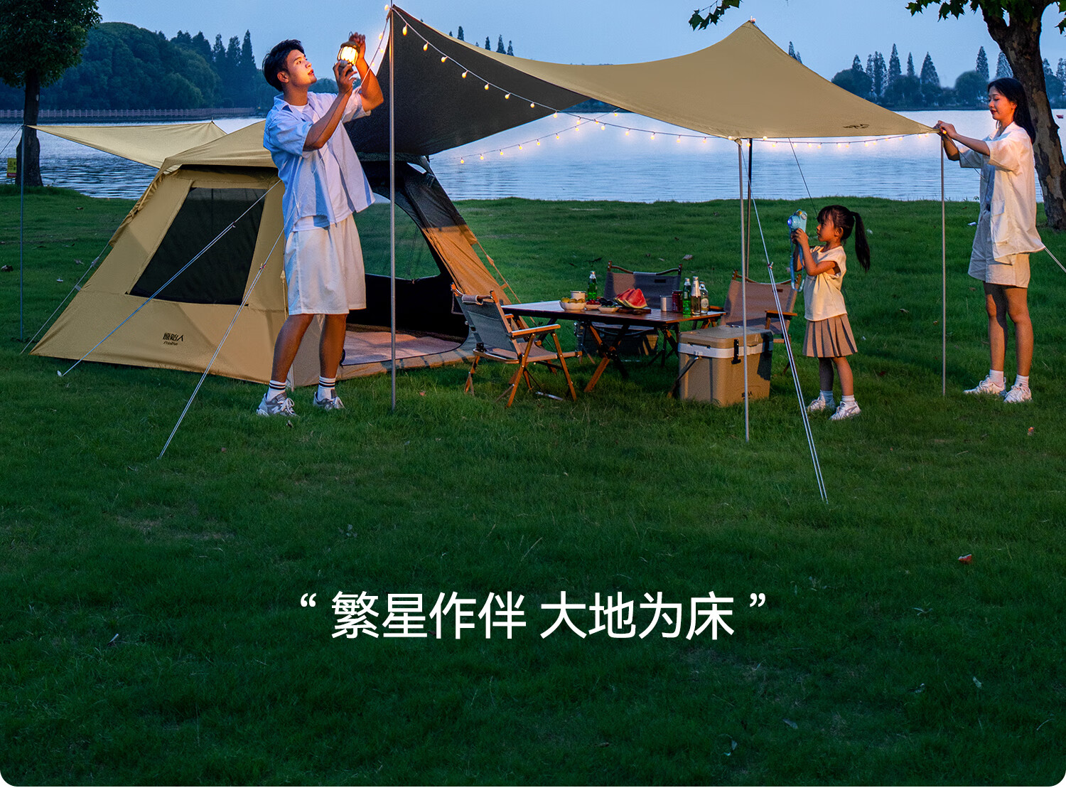帐篷支起来非常简单快速,三分钟搞定,天幕也就是第一次需要绳结打扣,之后把绳子收好就可以非常快速完成了,帐内空间大,四个大人躺平完全没问题,坐着可以更多人,天幕也完全够移用