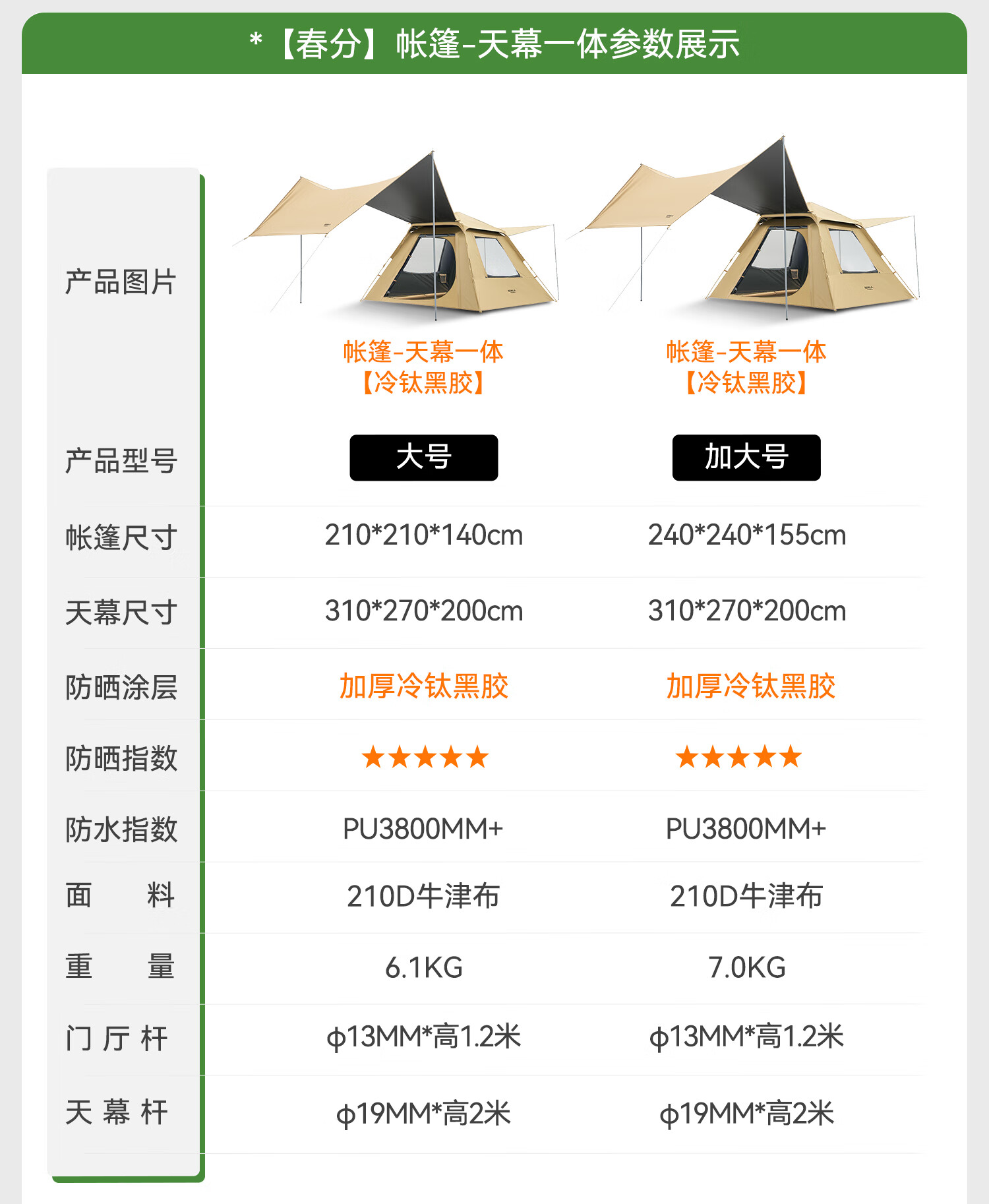 帐篷尺寸很大,三个人完全没问题,隔热效果不错,撑开也很简单,按照方向一撑就开,收起来也很方便,天幕是拉链连接到帐篷的,场地小没地方撑天幕,得很大的空地才行,里面自带防潮垫,很不错