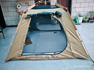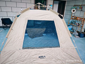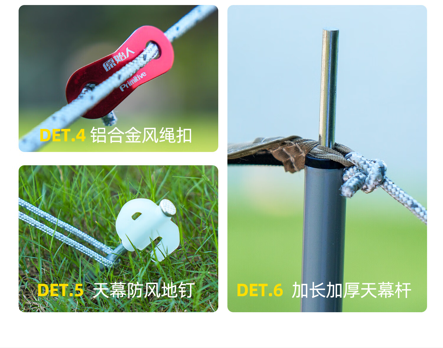 帐篷支起来非常简单快速,三分钟搞定,天幕 也就是第一次需要绳结打扣,之后把绳子收好 就可以非常快速完成了,帐内空间大,天幕也 完全够用