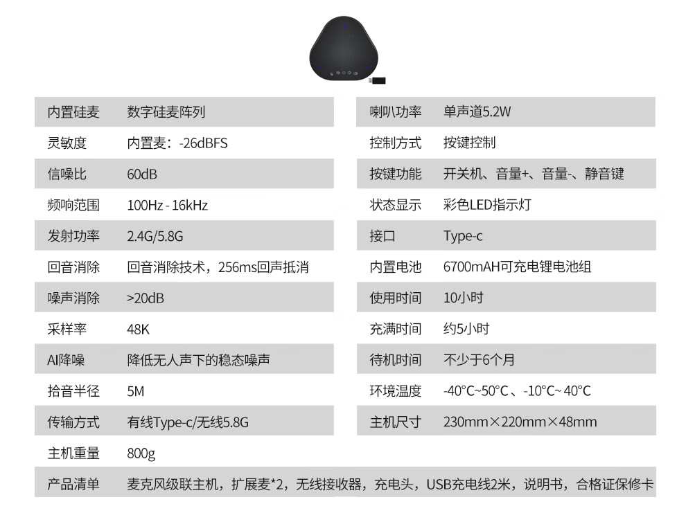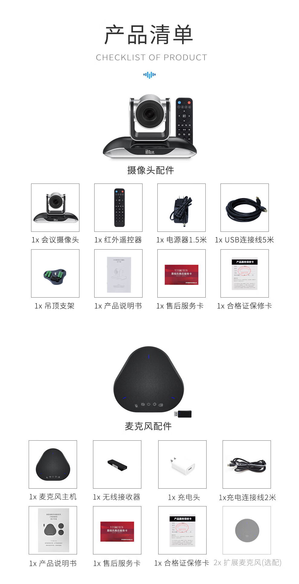 会议摄像头、无线麦克风、摄像头电源适配器、麦克风充电线、USB连接线、无线接收器、吊顶支架、合格证保修卡、产品说明书、遥控器、麦克风收纳袋