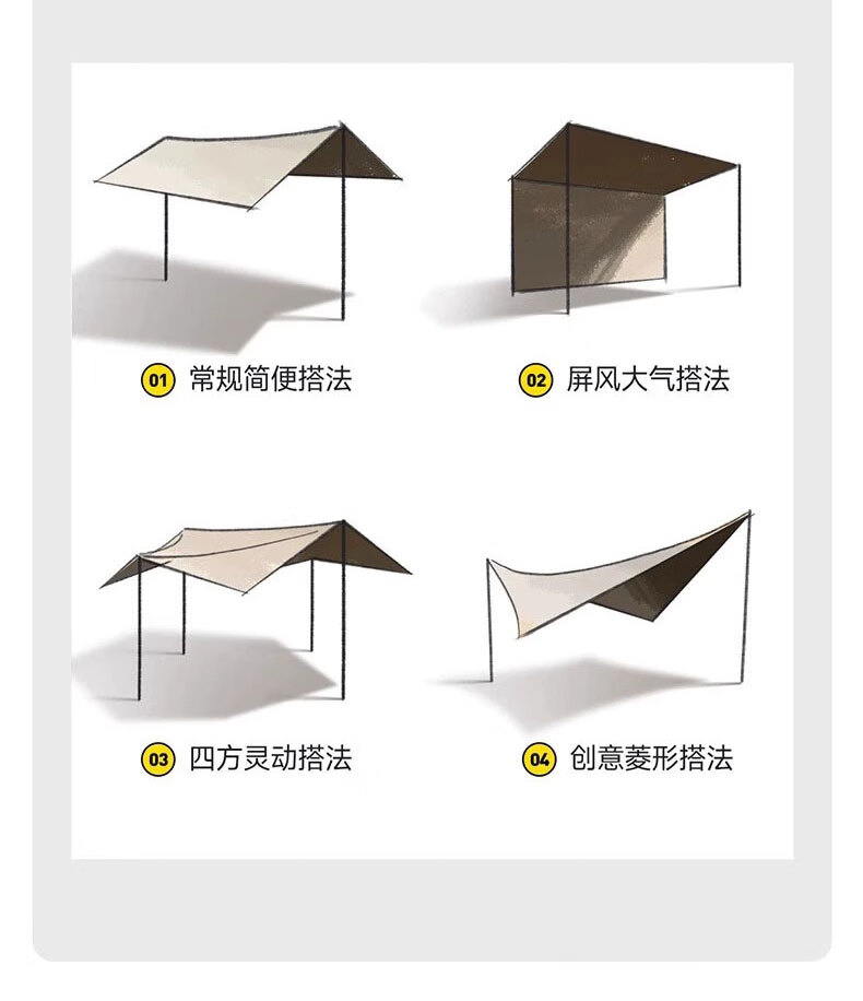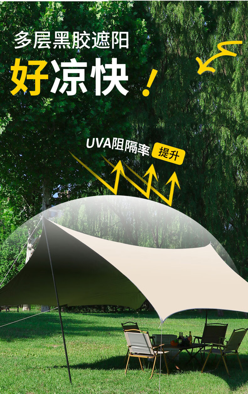 户外遮阳棚尺寸大遮挡雨水阳光效果不错,面料厚实耐磨不易褶皱,安装简单一会就弄好了,这下户外露营就用它了。