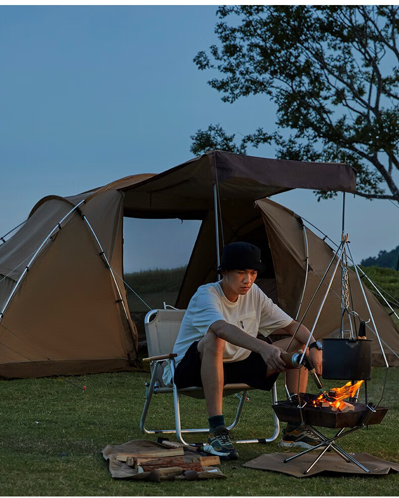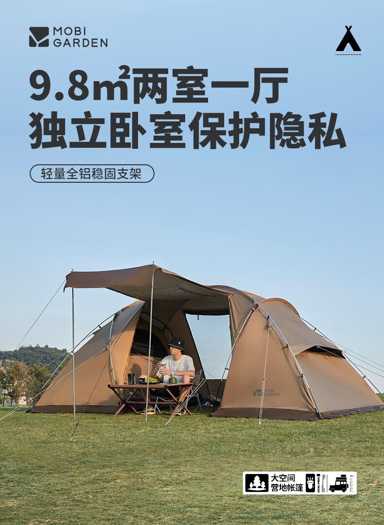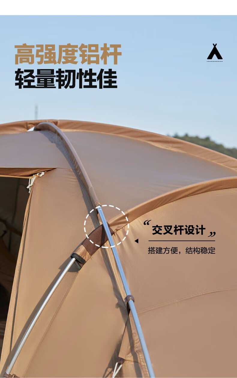 这款帐篷以高性价比著称,双门三窗设计通风出色,防雨PU3000mm涂层应对中大雨无压力。铝杆轻量稳固,搭建便捷,适合3-4人家庭露营。内帐透气网纱防蚊,外帐耐磨抗撕裂。细节如内置储物袋、夜光拉链实用,但地钉强度一般。整体是入门级家庭帐篷的优质选择,适合公园露营或短途轻野营。