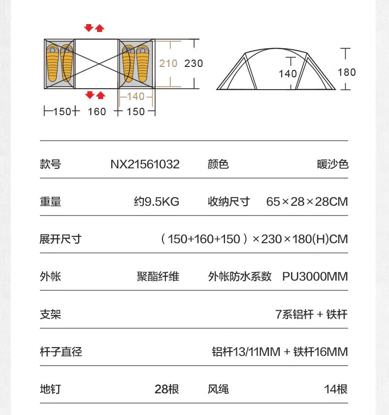 帐篷非常奈斯,性价比很高!空间感很好,一家三口使用绰绰有余~开着两侧纱网过夜还是比较闷热,通风和世家6有很大差距,不过这个价格,还要啥🚲!就是风绳少了三根,虽然沟通补发了,却不是原版的,小郁闷~