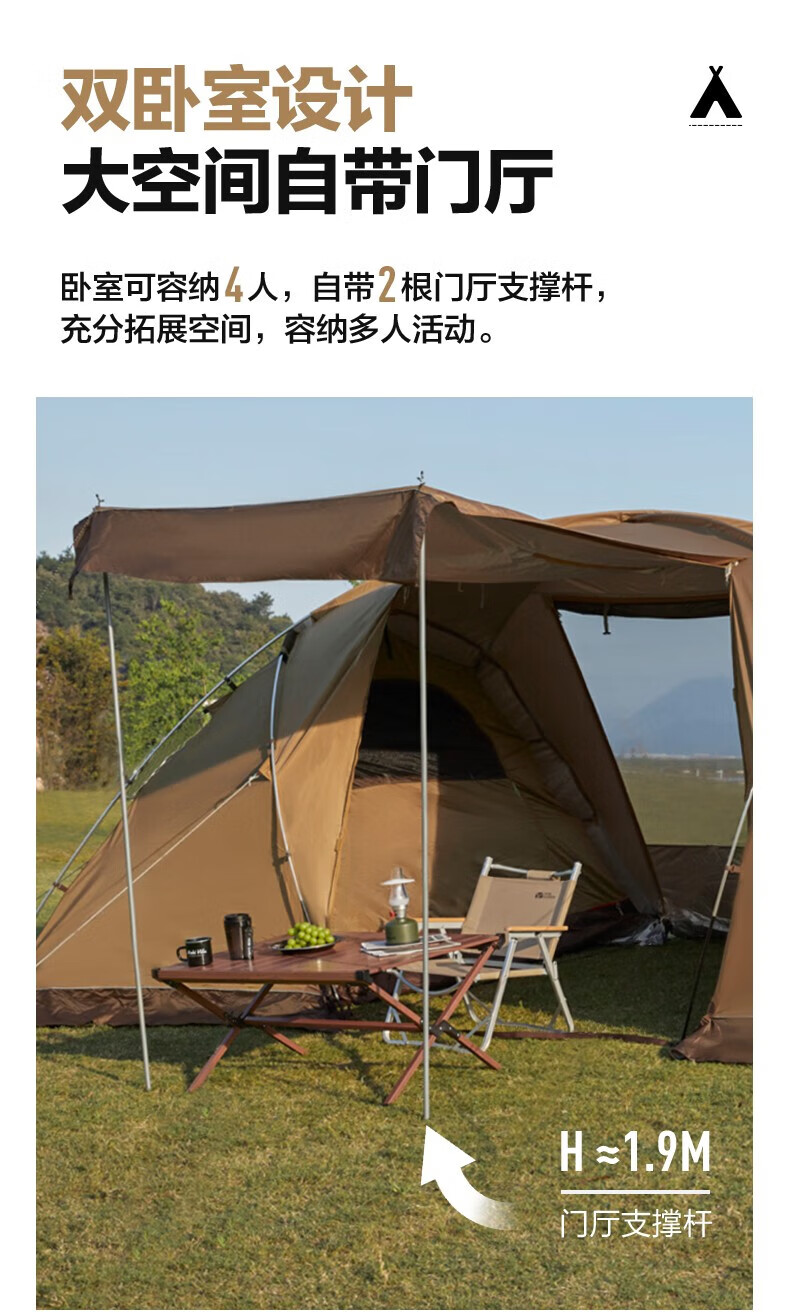 牧高笛(MOBIGARDEN) 户外精致露营帐篷双开门透气牛津布防晒防雨两室一厅大空间世家4 世家4-橄榄绿(升级带幕布)