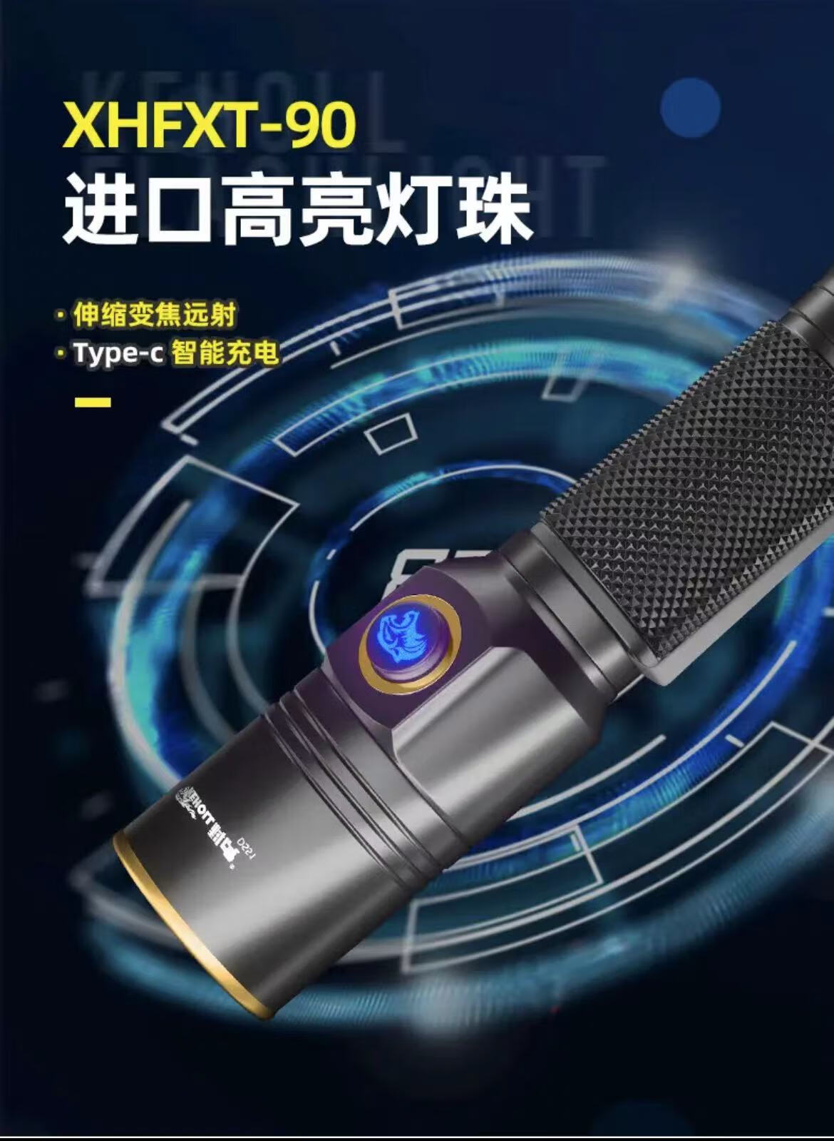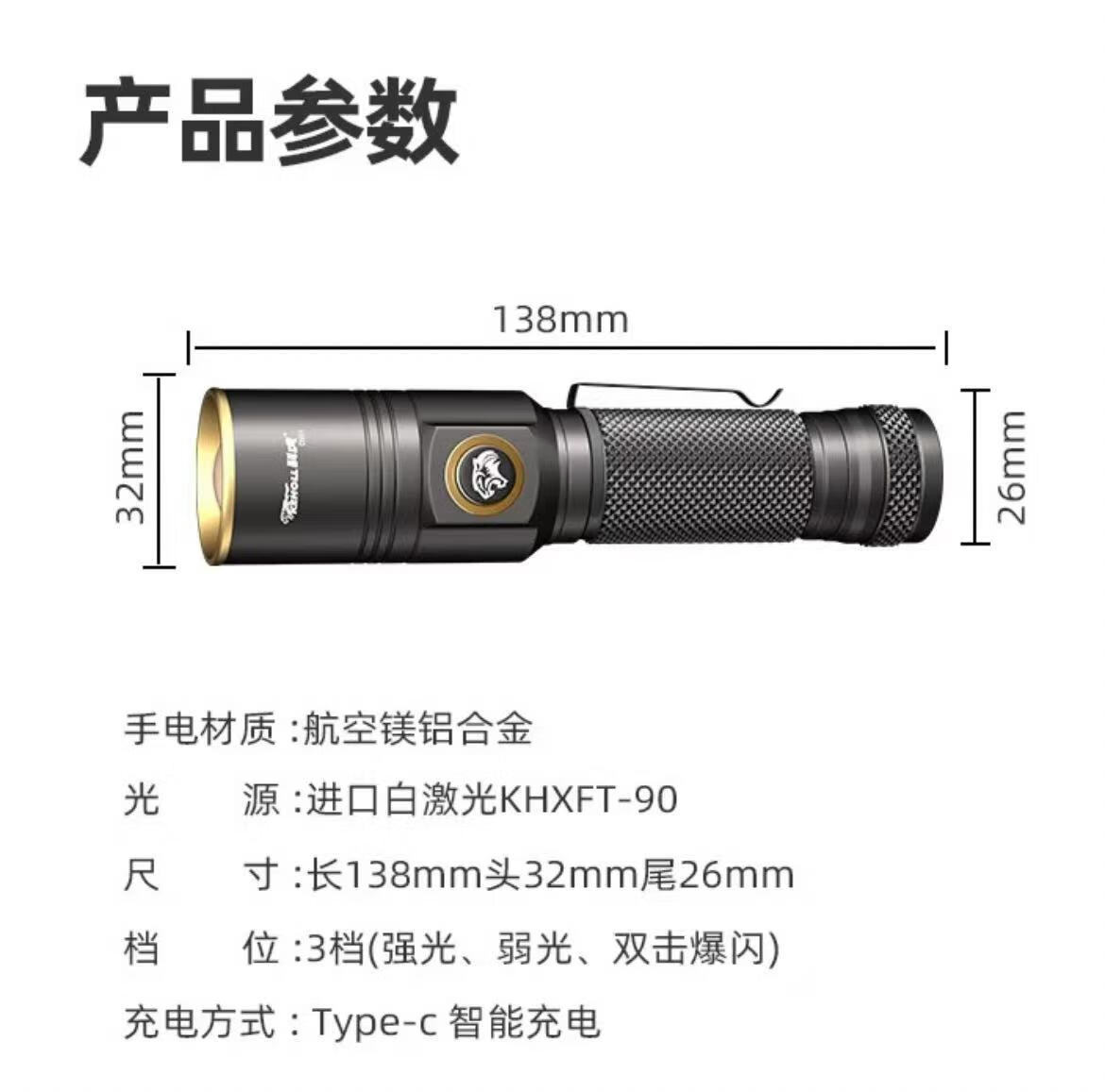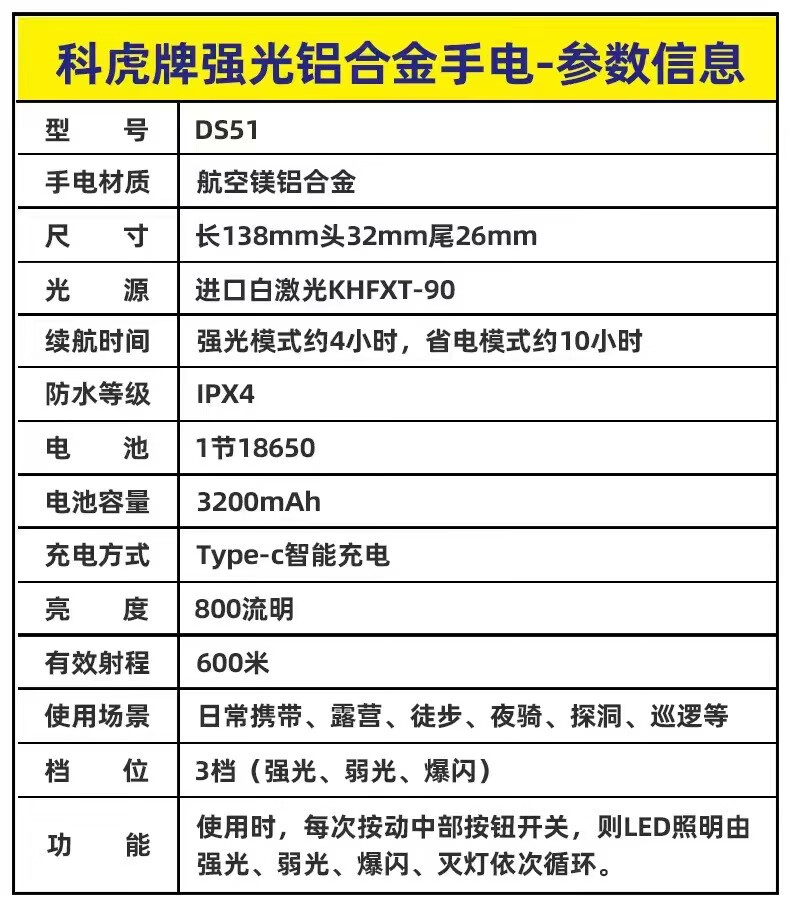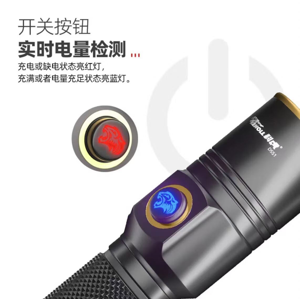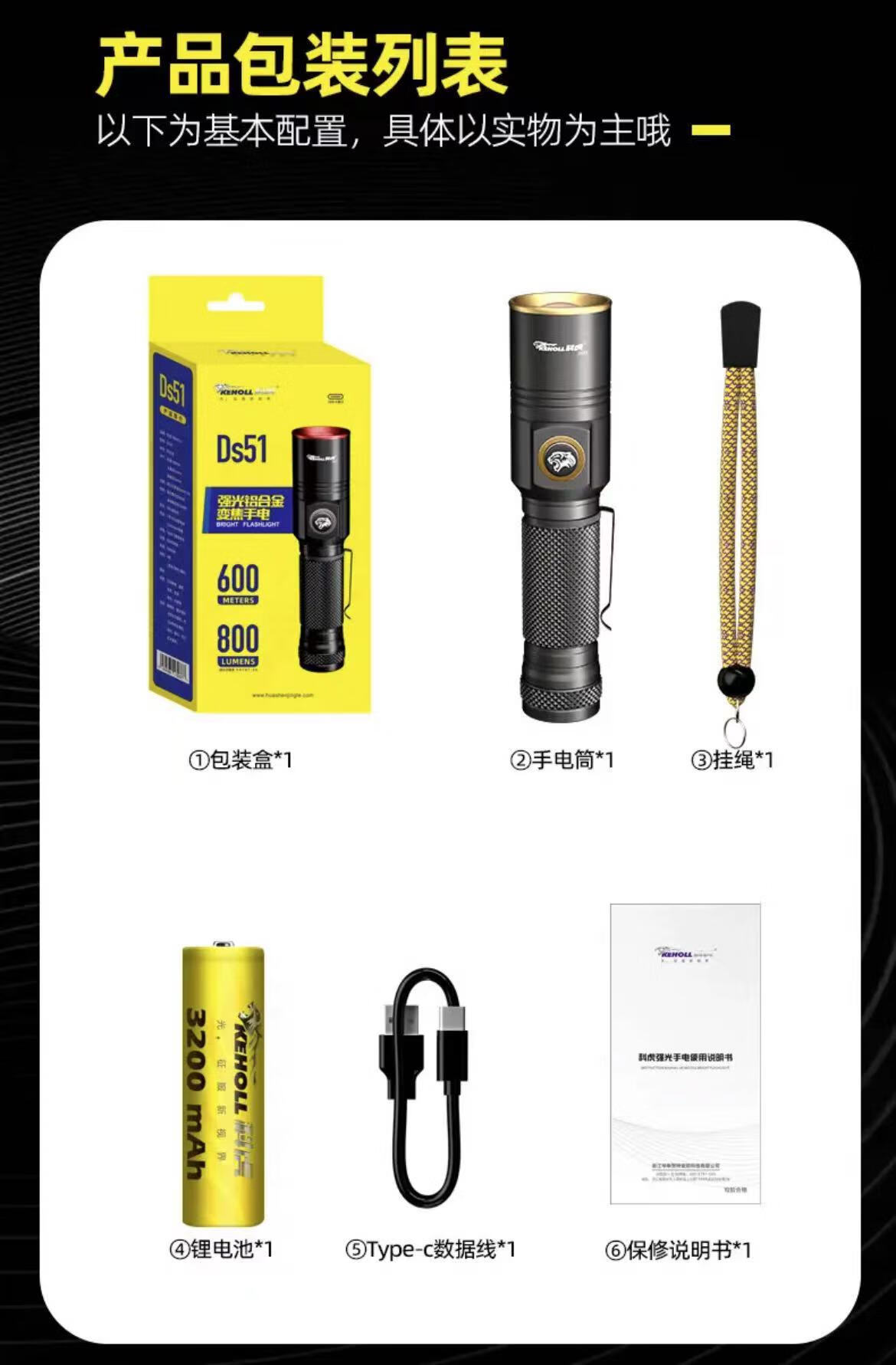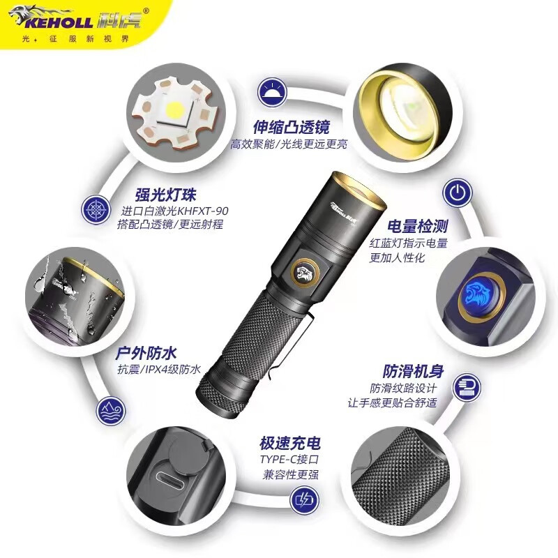 科虎(KEHOLL)户外DS51电筒超亮远射TYPE-C充电LED强光变焦激光 随机发