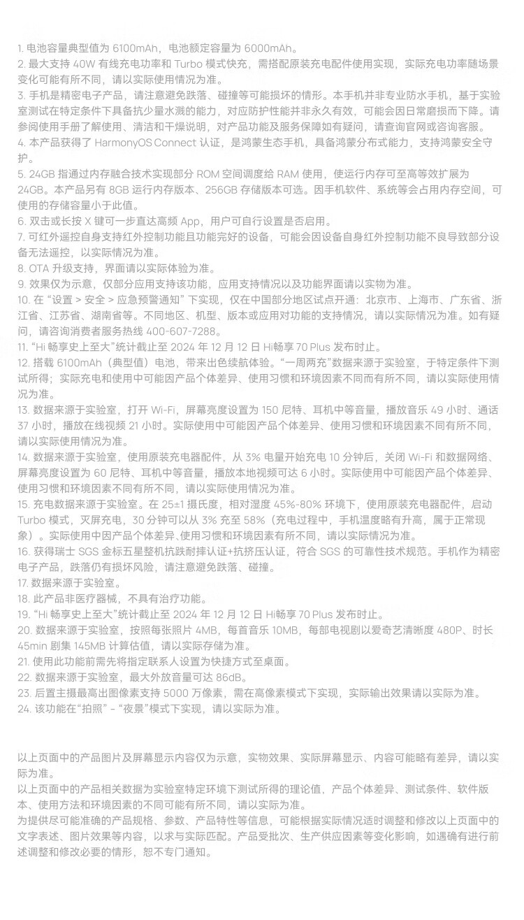 华为 华为5G手机Hi畅享 70 Plus 6100mAh巨鲸电池 送长辈送老人 鸿蒙安全守护5G 2025新款5G手机 冰晶蓝 12G+512G