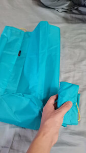 这是展开和未展开的比较,非常满意! 重量完全可以忽略,但是扛拉性和防水性非常不错! 防水收纳袋宁愿稍微贵一点,也别在野外因为衣物打湿而出点事情