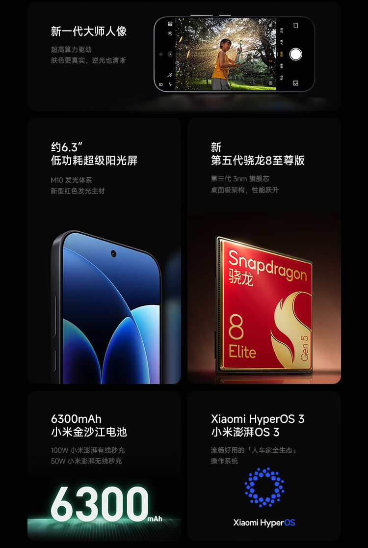 小米17 Pro:小屏旗舰,全能真香 小米17 Pro太懂用户需求了!6.3英寸直屏单手握持超舒服,1-120Hz自适应刷新率+护眼调光,观感流畅又不累眼。 第五代骁龙8至尊版性能拉满,《原神》满帧运行不卡顿,370万跑分实力在线。6300mAh大电池太顶,重度使用一天剩电不少,100W快充半小时就能满血。 徕卡影像果然能打,光影猎人950L主摄拍夜景纯净清晰,5倍长焦连远处细节都抓得准,直出图自带质感。妙享背屏接电话、自拍预览超方便,实用性远超预期。 澎湃OS3流畅丝滑,跨设备联动省心。4999元起能买到这样无短板的旗舰,闭眼冲不亏!