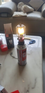 到货了,盒子装的过于紧实了,拆了老半天才打开盒子。送了一个高压转立罐接头,不带密封。灯头跟赠送转接头拧紧之后有缝隙(公螺纹比较长)。送了三个灯罩还有挂装链条(个人觉得这个链条用处不大,点过后会很烫,挂不住) 灯的话自带了一个电子打火,使用手册没说明需要打开玻璃罩才能点火,没用过的时候在底下按点火装置很容易在点火的瞬间被从底下喷出来的火烫伤。点两次之后玻璃就很烫了。